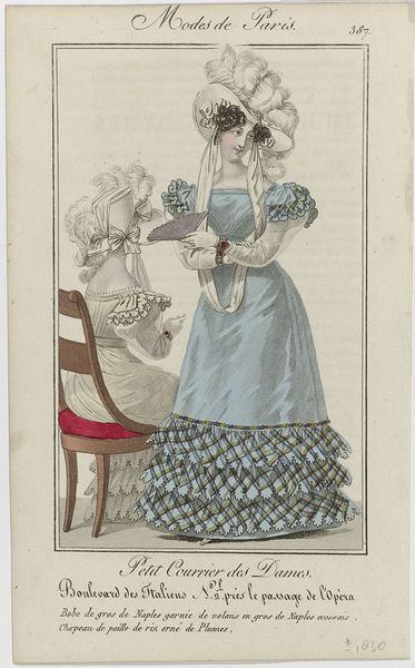 Curator: So, here we have an image titled “Petit Courrier des Dames, 1829, No. 657: Coiffure Exécute par Mr. Croisat...” from 1829. It is a print drawing with watercolour and illustrates the latest fashions in Paris. Editor: Oh, isn't this charming? It evokes a certain polite wistfulness, almost like peering through a slightly faded window into another era. The colours are so soft, faded to pastels. Curator: Absolutely. Fashion plates like this served as vital communication, disseminating style trends. What details draw your eye first? Editor: The woman’s hair, definitely. I see beehive styles re-emerging. It makes me wonder how much of that coiled effect is achieved through careful styling and how much with extensions or padding. It feels precarious. Curator: Good eye. Hairstyle was a statement. You can see its construction was carefully dictated as noted at the bottom. Beyond the hair, do you notice anything intriguing? Editor: I'm noticing a sense of controlled excess. The gown's fabric seems light, yet it's layered with ruffles and adorned with what look like floral details at the bottom and at the shoulders. The silhouette emphasizes the waist. A fascinating mix of airy delicacy and structured formality. I sense that ribbons also play an important symbolic role. Curator: Ribbons always did in clothing—especially as the middle class rose. I wonder too about the other figure seated off to the left: why is she sitting, almost passively? Editor: I perceive this arrangement, almost photographically staged. But consider the other. Perhaps the seated woman awaits her own "debut" moment. Is she observing, is she introspecting? And from where exactly do we, the observers, receive the image and interpret? It suggests that identities could always be curated and made into an image. Curator: Exactly, this artwork is both revealing and concealing. Well, reflecting upon the curated imagery and fashion, the "Petit Courrier des Dames" offered its readers just a glimpse of a fashionable world. Editor: Ultimately, it serves as a portal, doesn’t it? The whispers of lace, the promise of transformation through attire. I can almost smell the perfume through the aged paper.