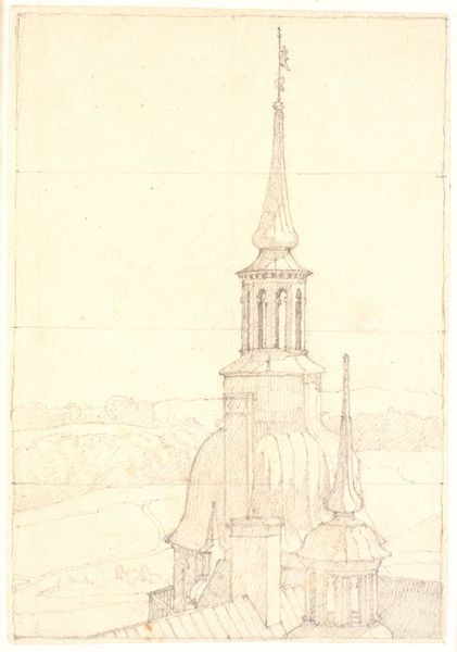 Peter Becker made this drawing of a Church tower in Hausen, using graphite on paper. The subtle variations in tone and texture achieved with the graphite pencil are crucial to the image's aesthetic effect. Look at the fineness of the lines used to define the architectural forms. The artist has used hatching and cross-hatching to build up the darker tones, creating a sense of depth and volume. The visible strokes of the pencil, and the artist's hand, emphasize the process of creation. Drawing has a long tradition as a fundamental skill for artists and architects. Here, it is used as a tool for observation and documentation, as well as artistic expression. The simplicity of the materials contrasts with the complexity of the architectural structure, reflecting the relationship between the built environment and the artistic process. It also has an important social function, as a prominent place of worship in a small town. Considering the materials and the making of this drawing reminds us of the rich history and cultural significance embedded within even the simplest of artworks.