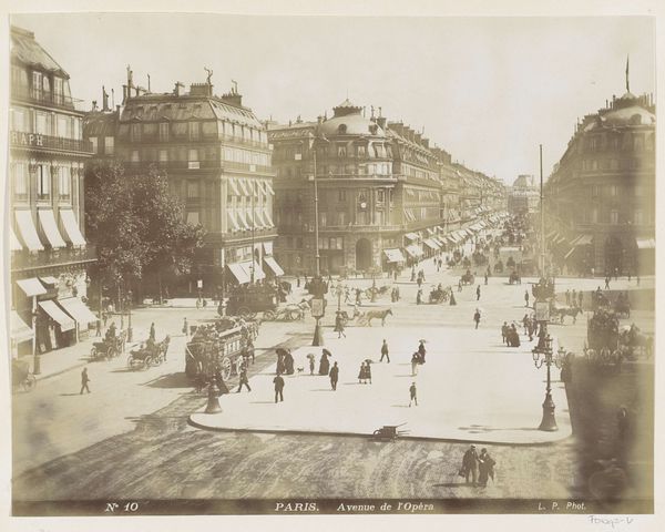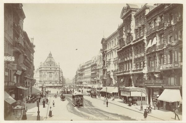 This photograph of Rue Canebière in Marseille was taken by Neurdein Frères. Though the exact date is unknown, it was made using a process that renders remarkable detail. Photographs like these are often viewed simply as documents, yet they are material objects, too. The tones and textures we see here are the product of chemical reactions, and of course the viewpoint of the photographer: their choice of composition and perspective. This image presents an expansive vista of a bustling street. It is crisscrossed by the traffic of horse-drawn carriages, the latest technology of the time, enabling the efficient movement of people and goods, indicative of rapid industrial growth and urban development. Consider the labor involved, too, in the manufacture of the camera, the preparation of the photographic plates, and the printing of the final image. All of these factors shaped the image we see, making it more than just a simple record of a street scene.