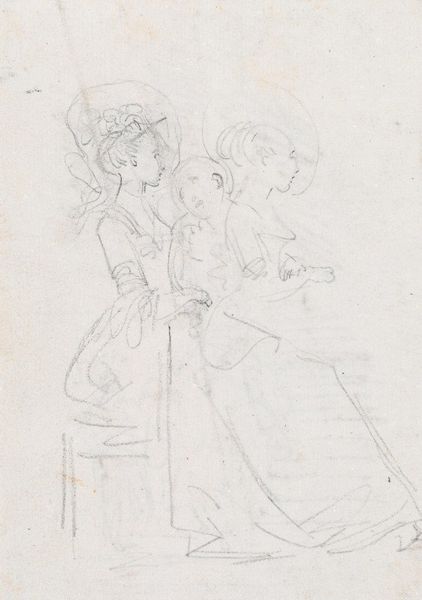 Curator: At first glance, there's a softness to this sketch. It’s ethereal, almost melancholic. Editor: Indeed. We’re looking at a pencil sketch created by Sir John Everett Millais between 1855 and 1856. It’s entitled "Tennyson’s The Lord of Burleigh – The Death of Lady Burleigh – Sketch of the Nurse and Boy." It represents one stage in the illustration process related to Tennyson's poem, capturing a somber domestic scene. Curator: The way Millais uses such light strokes, it almost feels like a memory fading. Look at the lines, they're suggestive more than definitive, leaving much to our imagination. I feel the Pre-Raphaelite style shining through the delicacy and intimacy portrayed here. Editor: The sketch is particularly compelling when considered in the context of the Victorian era's preoccupation with illness, motherhood, and mortality. Tennyson’s poem explores social class and its inherent tragedies; Millais’s work reflects that by presenting a tender yet clearly sorrowful scene of a nurse and child. Note how art and literature intersect, where social narratives became potent sources for visual representation. Curator: Observe how Millais masterfully uses shading and line weight to give depth to the figures, even in a preliminary sketch. The way the light catches the baby's face, for instance, creates a focal point despite the sketch's incompleteness. Editor: And it begs the question: what societal roles were being assigned to women in that era? As for visual composition, this preparatory drawing is more than just lines on paper. Millais carefully blocks in shapes for the subjects, the sketch’s openness serving as a study on character—not unlike mapping of moral terrain. Curator: It is a poignant meditation on loss, framed in simple elegance of line. The entire composition resonates a tender grief, despite the bare execution. Editor: A powerful look at the artist's process and its intersection with poetic narrative and societal norms of its time. Ultimately it invites reflections of the relationship between the personal and historical in art making.