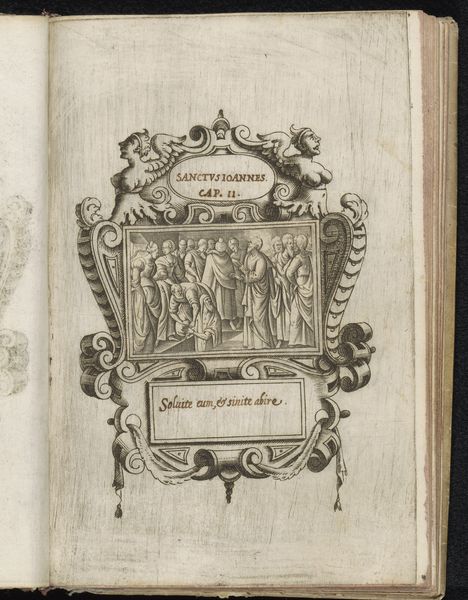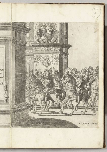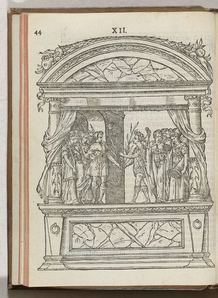 Editor: Here we have Antoni van Leest's "Third Decorated Scaffold with Stage: The Prince Frees the Virtues from Imprisonment," made around 1577-1578. It's an engraving, so it's full of intricate lines. It seems to depict some kind of performance. How do you interpret this work from a formalist perspective? Curator: The formal elements are indeed quite striking. Notice the emphatic lines defining each figure and architectural detail. This emphasis creates a distinct separation, almost a theatrical staging, between elements. Editor: It does look like a stage. I see figures within what appears to be a proscenium. What do you make of that architectural framework around the central scene? Curator: Precisely. The heavy architectural frame – the columns, the pediment – acts as a compositional device, focusing our attention. Consider, too, how the lines of perspective converge, creating depth within the flattened plane of the engraving. It's a fascinating play with dimensionality. Editor: So the architecture isn't just decoration; it's guiding our eye. What about the arrangement of the figures themselves? Curator: Notice how they are clustered, almost trapped within a defined space. The linear quality reinforces that feeling of constraint. It prompts us to ask: how does the linear treatment impact the sense of movement, and freedom as described in the title, within the work? Is there perhaps an interplay between the linear constraints and the represented narrative? Editor: It does seem like a contradiction. The sharp lines seem to confine the 'virtues,' yet they are supposedly being freed. The form seems to challenge the narrative. Thank you. This linear approach is helpful for future engravings. Curator: Indeed. Examining the visual structure reveals a complexity that invites further study.