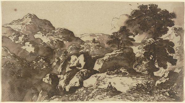 Editor: This is an intriguing piece! It's a drawing titled "Hilly Landscape with Figure in Foreground", the artist is unknown, and it appears to be made using pen, pencil, and ink on paper. It feels almost dreamlike, with swirling lines defining the landscape. What do you see in this work? Curator: I see a symbolic journey embedded within the landscape. Consider the figure in the foreground: dwarfed by the immensity of the hills. The journey motif is strong: what trials must this figure face as they negotiate this geography? Editor: That's a good point. The path is definitely not clear. How do the materials used, like the ink and the pen, contribute? Curator: Ink possesses a historical weight, particularly in landscape traditions of the East. It allows for layering and shading, but it also demands a certain confidence, a decisiveness of line. Note also how the line quality – at times flowing, at others scratchy – may reveal an ambivalence towards nature, the land appearing simultaneously nurturing and challenging. What do you make of the castle at the top of the hill? Editor: Oh yes! It's a bit obscured by the trees. It adds a narrative element – a destination, maybe? A symbol of authority? Curator: Or perhaps a symbol of aspiration, of an ideal just out of reach. Castles frequently carry those meanings across many eras. This is, remember, not just a pretty picture; it's potentially an externalization of an internal state. The figure seeks something, and we, the viewers, are invited to contemplate what it might be. Editor: That’s a much richer reading than I first considered! It shows how even seemingly straightforward landscapes can be loaded with meaning. I definitely see it differently now. Curator: Indeed, symbols often hide in plain sight. Once seen, the landscape resonates beyond its immediate appearance.