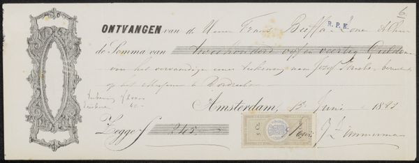 This receipt, made in Amsterdam in 1889 by Frans Buffa en Zonen, documents a payment made to Willem Bastiaan Tholen. At first glance, it’s just ink on paper, a quotidian record of a financial transaction. Yet, it’s a window into the economic underpinnings of the art world. The elegant script and careful layout speak to the skilled labor involved in producing such documents. Paper itself, though seemingly simple, represents a complex history of production and trade. The receipt acknowledges the exchange of three hundred and seventy-five guldens for ‘free aquarelle’. This suggests the payment was for an unbound watercolor, a medium often associated with spontaneity and ease. However, the receipt reminds us that even the most fluid artistic expressions are entangled with commerce, labor, and material exchange. It challenges our notions of artistic creation, highlighting the economic structures that enable and sustain artistic practice.