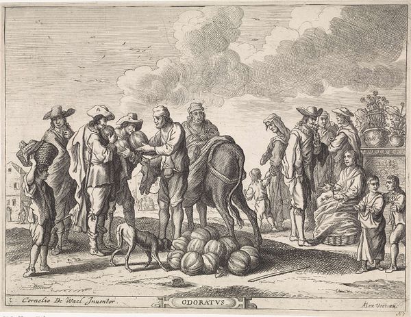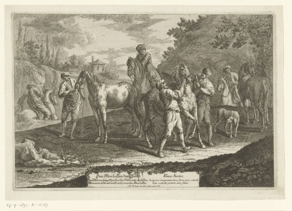 Curator: What strikes me first about Jan van Huchtenburg's "Aanvoerders te paard" – likely made between 1673 and 1709, given the scope of his career – is its textural richness for an engraving. Editor: It's quite stark, isn't it? Somber even. There's a formality here that feels detached from any real conflict; more about displaying power than depicting its consequences. Curator: The engraving medium is vital. Its relative reproducibility allowed wider dissemination of imagery portraying leadership and military campaigns, influencing public perception in ways paintings, for example, simply couldn't at the time. Editor: But at what cost? This idealization of warfare conveniently elides the suffering endured by common soldiers and the communities caught in the crossfire. These leaders appear almost theatrical, elevated above the fray. It serves as effective propaganda, yet problematic history-painting, that further glorified military conflict. Curator: We must consider this drawing within the context of baroque art, of course. Notice the detailed rendering of the horses’ musculature, and how light plays across the fabrics of their rich attires. The act of creation itself involves significant artisanal skill and collaborative work. Editor: While admiring the artisanship, I’m wary of its social function. This image actively participates in creating heroes and perpetuates hierarchies that empower certain people while disenfranchising others based on class, or service. We should acknowledge that Van Huchtenburg's image contributed to a certain kind of social narrative. Curator: I see your point. We should investigate the workshops. The engraver’s skill made it easier for Van Huchtenburg's statement on aristocracy to become popular, spreading images of those aristocrats. Editor: Exactly, that the piece even hangs at the Rijksmuseum speaks to the art and historical world’s participation in these continued stories of oppression and power. Curator: This gives me more to consider concerning the history behind such artistry. Editor: Absolutely, and perhaps we have given listeners more to consider about history too!