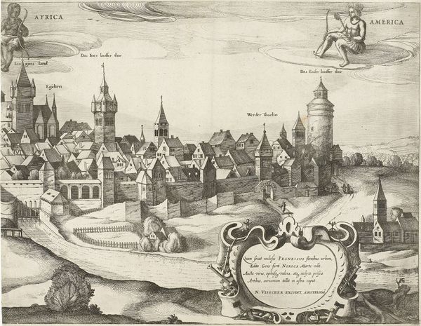 Editor: Here we have a 17th-century engraving, "Vasilij-katedralen i Moskva," which translates to Saint Basil's Cathedral in Moscow. The anonymous artist gives us an intricate cityscape view of the famous landmark. It's just...so detailed for such an old print! What strikes you about it? Curator: I see a layering of cultural narratives encoded within this image. The cathedral itself, with its distinctive, almost fantastical domes, becomes a powerful symbol, not just of religious devotion, but also of Russian identity and imperial ambition. What stories do you think this image is trying to tell us about power? Editor: Power? I mostly see religion, the way the people in the foreground are posed, all reverent and stuff. Curator: Observe how the architecture looms over the figures. These are deliberate choices by the artist, and remind us of divine power, yes, but also the might of the Tsarist regime. This structure is an architectural echo of heaven on earth, visually enforcing a spiritual and political hierarchy. Even the printmaking process reinforces cultural memory here – how do you think engraving enhances the perceived truthfulness of an image versus painting? Editor: Hmm, engraving makes it seem more...official somehow, less subjective. Like a historical record. So, you're saying the visual language isn't just about the cathedral, but the statement it makes? Curator: Precisely. Think of how the towers, a fusion of Byzantine and Islamic architectural motifs, narrate a complex history of cultural exchange and conquest. Every line is charged with historical memory. I’d be curious to study any documents from that period to learn more about cultural perception then. What do you think this image says about cultural memory today? Editor: I guess... that buildings can be like time capsules? This print helped me realize that images do way more than just show things; they carry beliefs and ideas, too. Thanks for pointing that out!