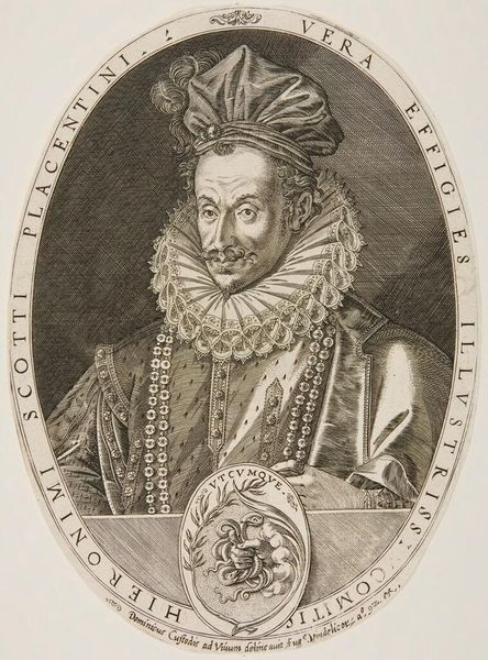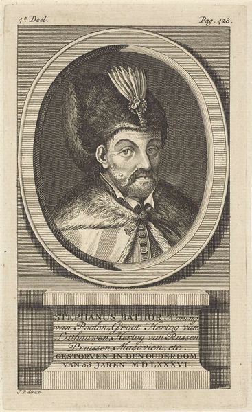 Editor: So, here we have an engraving from somewhere between 1665 and 1698, entitled "Portret van Ottomaanse graaf Alberto Caprara met bontmuts," or, "Portrait of Ottoman Count Alberto Caprara with fur hat," by Jacques Blondeau. It's striking how the oval frame emphasizes the Count's face and imposing fur hat. What initially stands out to you? Curator: I am struck by the sophisticated deployment of line. The artist achieves a remarkable range of textures and tones, purely through varying the density and direction of the engraved lines. Note, for instance, the stark contrast between the smooth, almost planar surface of the face, achieved through fine, parallel lines, and the chaotic, radiating lines used to depict the voluminous fur hat. Editor: The contrast you highlight is indeed masterful. Do you see any evidence of symbolic meaning, beyond just representation? Curator: Observe how the artist frames Caprara within the oval, directing the viewer's gaze to the interplay between his resolute gaze and the textural richness surrounding it. Semiotically, the hat signifies status and possibly allegiance given the work’s historical context – does it not invite contemplation of power, diplomacy, and perhaps even the complexities of cultural identity during that era? Editor: That makes me reconsider my initial view, seeing it less as a mere portrait and more as a carefully constructed statement. It's amazing to consider how much visual information an artist can convey through such relatively simple means! Curator: Precisely, an attentive study to the structure of an artwork is key.