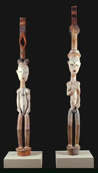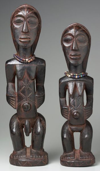 This is one of a pair of wooden "Female Figure" sculptures made by the Tabwa people. The dark wood, carved with meticulous attention to form, presents a study in geometric abstraction and bodily representation. The figures stand rigidly, yet their smooth surfaces and rounded edges invite a tactile appreciation. The incised geometric patterns, particularly the cross-hatching on the torso, serve not merely as decoration but as a semiotic system. This network of signs may reference cultural concepts of beauty, scarification, or social identity, encoding layers of meaning within the artwork's structure. The beads encircling the neck disrupt the smooth flow of the sculpture, introducing texture and color that draw attention to the head. The sculptor destabilizes traditional notions of portraiture through abstraction and geometric precision. The result is a powerful meditation on form, identity, and the cultural codes embedded within visual representation. This piece offers a chance to reflect on how art functions as a complex interplay of aesthetics, symbolism, and cultural values, inviting endless interpretation.