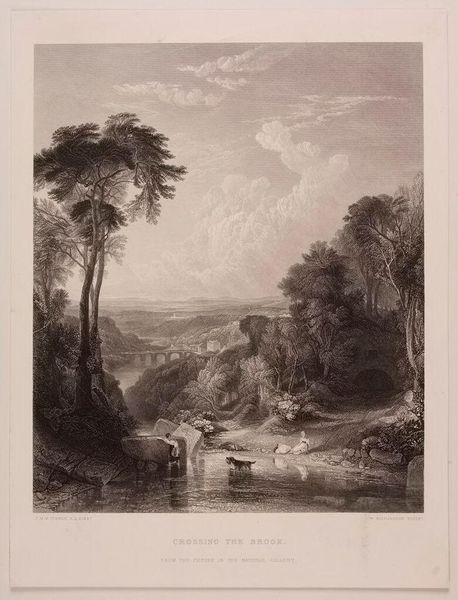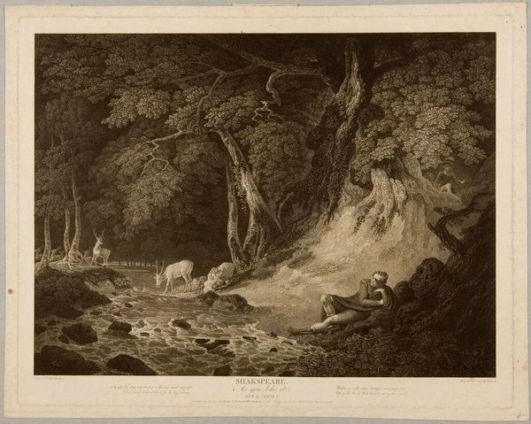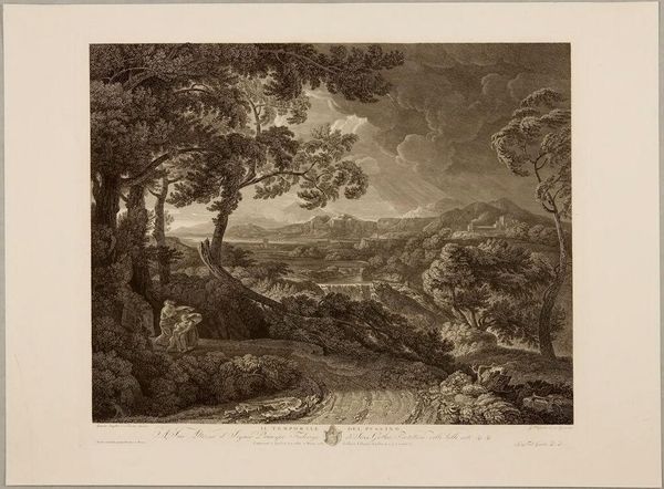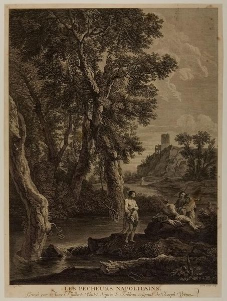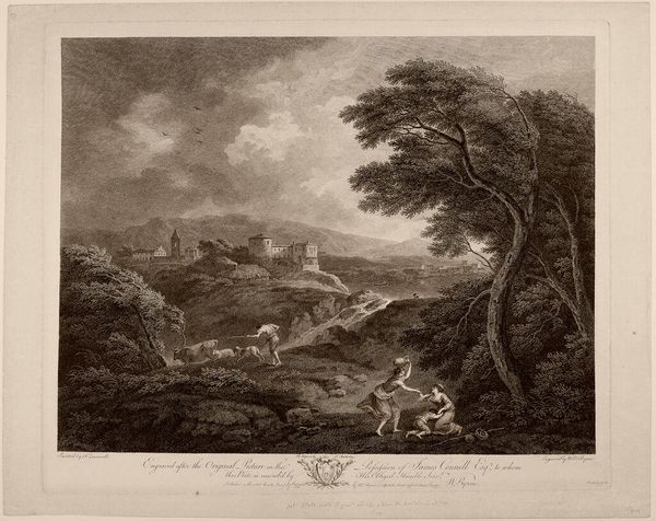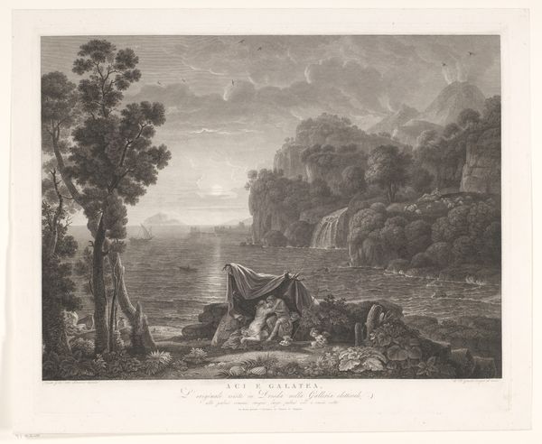 Editor: Here we have Friedrich Wilhelm Gmelin's "Acis and Galatea." It's an etching, and I'm struck by the way the figures are dwarfed by the landscape. What can you tell me about it? Curator: Consider how the printmaking process itself impacts our understanding. The labor involved, the tools used, the very act of reproduction – it all mediates our relationship with this idealized scene. How does this industrial replication influence our perception of nature and mythology? Editor: That's a fascinating point. It definitely changes the way I see the romanticism in the image. I will never see art the same way. Curator: Indeed! The mass production of images like this speaks volumes about the consumption and dissemination of art in that era.