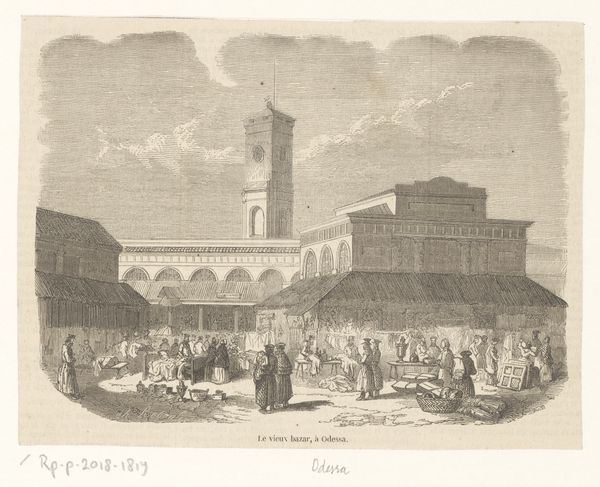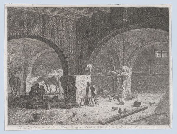Curator: Let’s turn our attention to “Kerkdienst in een dorpskerk,” which translates to "Church Service in a Village Church." Eberhard Cornelis Rahms likely created this etching sometime between 1833 and 1890. Editor: What strikes me immediately is the subdued atmosphere; it’s quiet and contemplative. There’s an intimacy to the scene, despite the grandeur implied by the church setting itself. Curator: Rahms has masterfully used the etching technique here. Notice how the lines vary in density and direction, creating textures and shadows that define the space and the figures within it. Look closely at the varied levels of craftsmanship; there’s skill at play in both the construction of the church and the depiction of the common folk gathered for worship. Editor: The architecture is loaded with symbolic meaning, especially if this is the main church in the town; the light streaming inward makes that main arched entrance act as a portal, symbolically emphasizing access to divinity, for all community members. Curator: It's interesting you interpret the image this way! From my view, focusing on the materiality of religious practice invites us to think about how shared belief intersects with communal spaces. This image captures how these elements converge to shape a sense of collective identity and experience. Editor: Absolutely, I see that point. And consider how these depictions are imbued with socio-religious codes reflecting this era’s social and spiritual anxieties. Are those communal identities based on sincere conviction, or something more performative or obligatory? It’s hard to say for certain from looking at a simple etching, though. Curator: Indeed. The print functions as an efficient, reproducible artifact; in contrast to painting, we are not focusing on a singular aesthetic genius here but mass production in service to broad distribution, reflecting on consumption patterns of the era and highlighting new access to a representation of communal identity and space. Editor: Fascinating how different contexts impact how we assess images. Ultimately, I suppose these different contexts inform how the etching participates in dialogues on belief, and community—conversations that are just as vital today. Curator: I think I agree, yes; I feel the material circumstances can allow for unique perspectives regarding how art affects our collective values and experiences, though, ultimately!