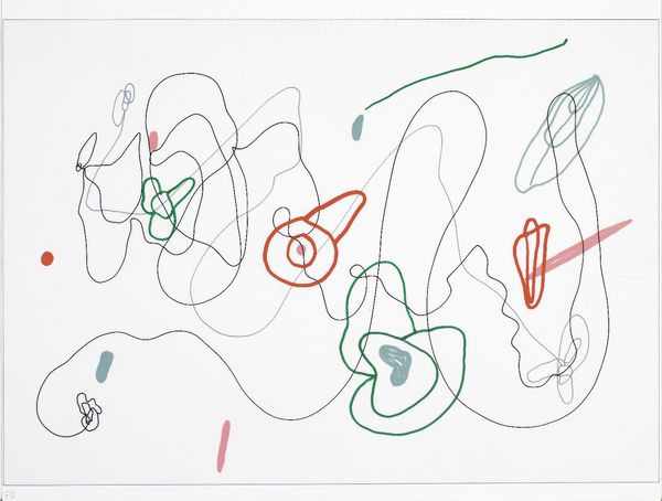 Curator: Looking at Pablo Rey's "Espacio Regulador #R07" from 2006, I immediately see this wonderful sense of playful chaos. The forms seem to float, unanchored, in this very clean, almost clinical space. Editor: It's deceptively simple, isn’t it? Rey created this drawing with ink and what looks like watercolor on paper. The geometric and organic shapes kind of reminds me of circuitry—a system struggling for order. Curator: I think the tension between the gestural doodles and the straight lines is exactly the point. Consider how those hand-drawn shapes are echoes of microscopic cells—memories perhaps—suspended within this stark field. They don't obey any traditional compositional structure, refusing to be constrained. Editor: Right, but how does this refusal manifest historically? It could be argued that the post-war abstract movement was an attempt to escape the confines of prescribed artistic doctrines. Rey appears to be continuing this trajectory of escaping traditional frameworks, not simply in art, but perhaps in broader societal norms as well. Curator: I think you’re spot on. These visual fragments invite us to make our own associations and discover connections that the artist leaves implicit. The individual symbols are somewhat rudimentary; like building blocks that the viewer has the responsibility to organize and relate. Editor: Exactly. And with a title like "Espacio Regulador," meaning “Regulating Space,” one has to consider the work’s implied criticism of power dynamics—how control can be a fragmented, abstract construct itself. Who is regulating this space and for what ends? Curator: In that way, this drawing has this wonderful ambivalence – It evokes freedom but also a vague sense of surveillance. I can see how it provides fertile ground to ponder. Editor: Me too, it makes me think about how institutional power is dispersed and less explicitly obvious to us now than in the past. Curator: Precisely. It leaves me feeling hopeful. There is freedom in these simple forms! Editor: Yes, despite everything. And its stark presentation gives that hope an undeniable edge.
