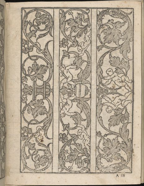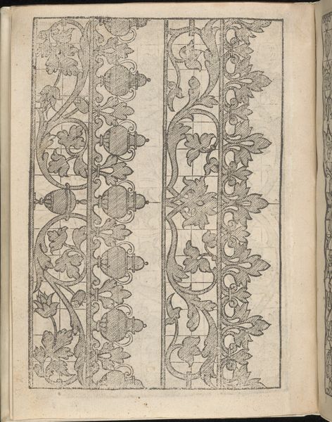 Curator: Well, look at this! Right away, I'm drawn to how whimsical and utterly serious it is, all at once. A sense of organized playfulness—isn’t that the best kind? Editor: We're looking at "Modelbuch aller Art Nehens vn Stickens (Page 6v)," a page from a book of embroidery patterns, created around 1535 by Christian Egenolff. It's a woodcut print, residing here at the Metropolitan Museum of Art. Curator: Embroidery patterns...imagine! Someone flipping through this book, planning their next masterpiece, a little stitch at a time. You feel this immense history when you're facing something like this! Editor: The formal qualities are indeed captivating. The black ink creates a stark contrast against the paper. The image consists of vertical bands filled with symmetrical, curvilinear designs featuring flowers, birds and ornate decorative elements. The use of line is particularly noteworthy—bold, unwavering, almost architectural in its precision. Curator: The birds are particularly intriguing, and somewhat playful. And that's quite the decorative flourish surrounding them! But still so contained... what’s it trying to say? I am sensing there are rules, aren't there? Even in ornamentation. I imagine that sense of decorative discipline resonated during the Northern Renaissance. Editor: Certainly. It speaks to a desire for order, yet the flowing lines and natural motifs soften that rigidity. Notice how Egenolff masterfully balances positive and negative space? The density of the patterns contrasts beautifully with the untouched areas of the page, guiding the eye. The designs’ rhythm, structure, balance and its texture feel both historically grounded and aesthetically timeless. Curator: The materiality! Think about the hands that touched this page, the slow act of carving the woodblock...each print a repetition, yet never quite the same. In an age before mass production, I mean. Each book opened by candlelight! Makes you ponder the human connection, doesn’t it? What about those of us who aren't familiar with textile patterns from the Renaissance, can we still connect to it, feel something? Editor: Indeed. I find that its universal visual language transcends the centuries, a quiet reminder that humans have always sought to adorn their world.