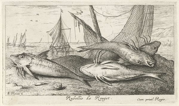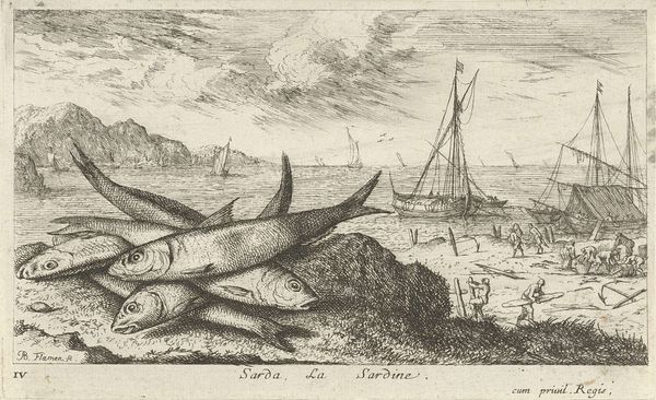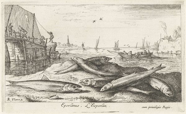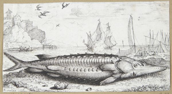 Editor: So, here we have Albert Flamen's "Steur op het strand," or "Sturgeon on the Beach," created around 1664. It's an etching, full of incredibly fine lines. The sheer size of the fish compared to everything else creates a somewhat absurd feel. What jumps out at you when you look at this print? Curator: It's odd, isn't it? That huge, almost cartoonish sturgeon dominates the scene, while in the background, life buzzes on with fishing boats and what looks like a naval battle! I think Flamen’s playing with our perception of importance. We tend to focus on grand historical events, battles, you name it! But what about the everyday wonders of nature, like this magnificent fish? Editor: That’s a great point! I hadn't considered that the artist may be satirizing how we interpret historical subjects. How did sturgeon fit into seventeenth-century Dutch culture? Curator: Sturgeon was a delicacy. Beyond that, this print encapsulates a lot about the Baroque era; the dramatic composition, an interest in the natural world… Maybe there's a comment here about Dutch prosperity built upon resources, and a gentle ribbing of their own obsession with exotic goods. Editor: I like that idea! The naval battle combined with the scale of the sturgeon could suggest prosperity resulting from nature. Curator: Absolutely! Look how delicately the artist uses line to define not only the texture of the fish, but also the activity in the background, from waves on the sea, to the buildings at the top left. Did anything about the image mislead you? Editor: Initially, I didn’t understand that the image was an etching because of the incredible detail, making it look photorealistic. Curator: It’s a good reminder to always look closely, isn’t it? There’s often more than meets the eye. Editor: Definitely! I’ll think about this piece – and sturgeon – differently from now on!