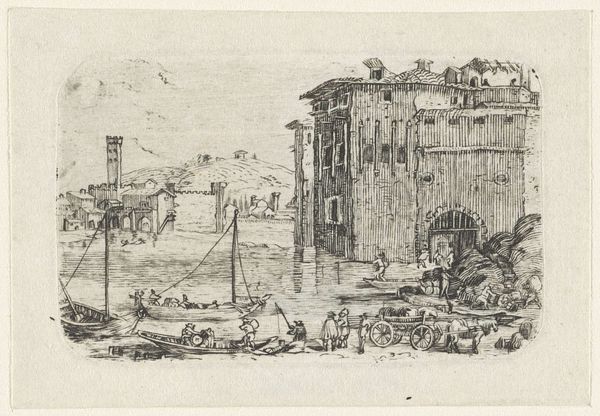 Curator: Here we have Cooper Nott Lansing’s 1949 print, "The Old Monarch." A rather evocative title, wouldn't you say? Editor: It's...somber. There's a stillness, an almost haunting quality to it, even with all the activity suggested by the structures. I find myself looking for figures, but only seeing buildings. Curator: Buildings which themselves are full of symbolism! Notice the towering grain elevators. These aren't just buildings, they represent the economic and agricultural heartland, particularly after the war when this was created. Think about the cultural weight of abundance and survival reflected in these images. Editor: Yes, and speaking to materiality, these are powerful industrial structures rendered with a seemingly delicate medium – printmaking. The tension between subject and method is intriguing. One wonders what type of ink and paper were available at that time, given wartime constraints, which certainly affects the overall presentation of the work. Curator: Precisely. There's also a deliberate realism in how he's captured the wear and tear. This isn’t a romanticized landscape. Look at the chipped paint, the haphazard construction. This place is functional, well-worn. It embodies the blue-collar American experience. There’s a very direct communication of the value and importance of industrial labor in supporting broader culture. Editor: It really gets at the grit of that experience. And these dilapidated sheds! Are they falling apart, or being actively torn down and rebuilt? They strike me almost like temporary shrines built up with intention, suggesting impermanence amidst a landscape geared toward massive endurance. Curator: They bring us down to ground level. It’s that interplay of grand industrial architecture against small-scale construction—and nature pressing in. The symbolic relationship here speaks volumes, considering the social realities. What elements are preserved? What needs to go? I think Lansing is trying to suggest a negotiation and re-examination of identity. Editor: A really great interpretation. This has made me think a great deal more about all of this now. It shows us there is more than meets the eye. Curator: Absolutely. The images continue to challenge us through many views, while opening opportunities for further consideration and study.