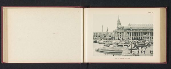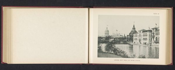 Curator: Charles Dudley Arnold captured this photograph, "Gezicht op het tentoonstellingsgebouw voor de Verenigde Staten en het Japanse paviljoen op de World's Columbian Exposition in Chicago in 1893", as part of his photographic record of the event. It’s an albumen silver print, and part of an album. Editor: It has such a serene, almost dreamlike quality, doesn’t it? The buildings seem to float on the water, and the grayscale lends a timelessness to the scene. The dome is an impressive, if somewhat generic, element. Curator: I agree. Let’s consider the social context. The World's Columbian Exposition was a stage for nations to display their industrial and cultural achievements, projecting power and progress. Arnold's work, therefore, serves as promotional material but also inadvertently captures the unequal power dynamics between participating nations. Editor: Focusing on the image, I'm drawn to how Arnold contrasts the imposing neoclassical architecture of the U.S. building with the more delicate and understated Japanese pavilion. The composition places the Japanese building in the lower foreground as a diminutive cultural statement that supports the colossal dome. There's a clear visual hierarchy at play. Curator: Absolutely. These choices in architectural display, immortalized in photography that was at the cutting edge of industrialization, also speak volumes about labor practices. Consider the extraction of silver and other materials necessary for photographic production, often done under exploitative conditions. Editor: We can appreciate the print's tonal range, from the almost pure white of the sky to the deep blacks of the water's reflections. These are finely graded, with delicate details in the architecture highlighted using careful lighting and developing techniques. This really maximizes the effect and visual grandeur. Curator: Exactly. Understanding the making and means of circulation lets us reflect on the consumption of the image as a marker of cultural superiority and imperial reach during that era. This photograph is not just a picture of architecture but a picture of constructed hierarchies, consumed on a mass scale. Editor: Considering it from a formal point of view—analyzing elements such as line, shape, and form—highlights the inherent beauty achieved. These are things that draw the viewer into Arnold's composition, transcending the specific historical context it's tied to. Curator: It's a collision of social, industrial, and aesthetic ideologies. Each layer gives context. Editor: An appropriate way to interpret turn of the century social, architectural and technological accomplishments.