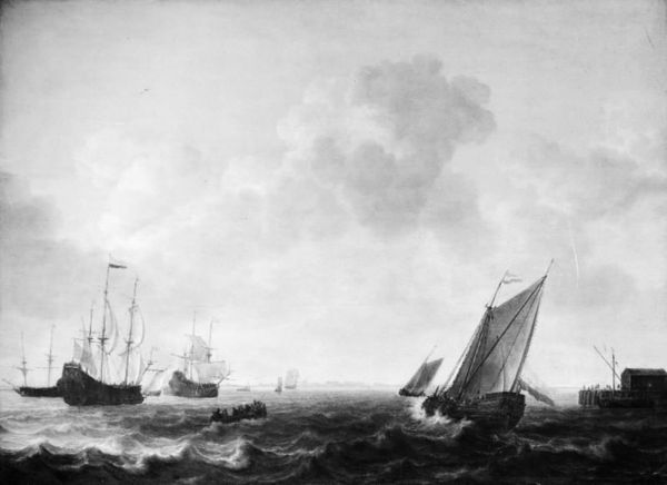 Curator: Here we have Aernout Smit's "The Sea in Motion" from 1678, currently housed at the SMK, Statens Museum for Kunst. It’s an oil on canvas piece. Editor: The churning water, the imposing clouds—there's an immediate sense of nature’s raw power. A dramatic, almost foreboding quality to the overall scene. Curator: Yes, the way he depicts the rough sea is compelling. Notice the thick application of oil paint; it really gives texture and weight to the waves, suggesting the labour and physical engagement required to create this vision. The monochrome palette really emphasises the materiality. Editor: Absolutely. And that contrasts with the fragility suggested by the small vessels. Boats appear so vulnerable amidst this tempest, becoming potent symbols of human struggle against overwhelming odds, don't you think? The image evokes stories of maritime exploration and the risks undertaken. Curator: I agree. When considering context, keep in mind the socio-economic power held by the Dutch in shipbuilding and maritime trade during the Baroque period. This image might serve to portray that dominion through control, but there is undeniable consumption in the work too. The material goods crossing these waters would have created a complex material hierarchy in their wake. Editor: That’s true. There's something romantic about it too, the lone boat with full sails slicing through the imposing water… perhaps the flags are intended as beacons of hope? Perhaps the pencil-like rendering, visible within those fine, sparse lines, hints towards hope even amongst struggle? Curator: Fascinating thought. These monochromatic shades encourage a consideration of resource availability: pigments, production costs and time expenditure, highlighting the commercial exchange that fuelled artistic endeavour. It speaks volumes about artistic materiality itself in the 17th Century. Editor: Ultimately, its evocative power persists beyond those original factors you mention. It continues to capture and channel human experiences in a way that many find so incredibly moving. Curator: Indeed, the image lingers in the mind. I’m glad we’ve explored that duality between material construction and sustained symbolics!