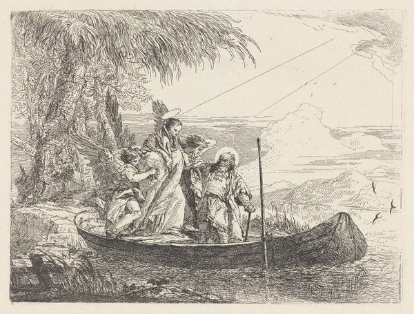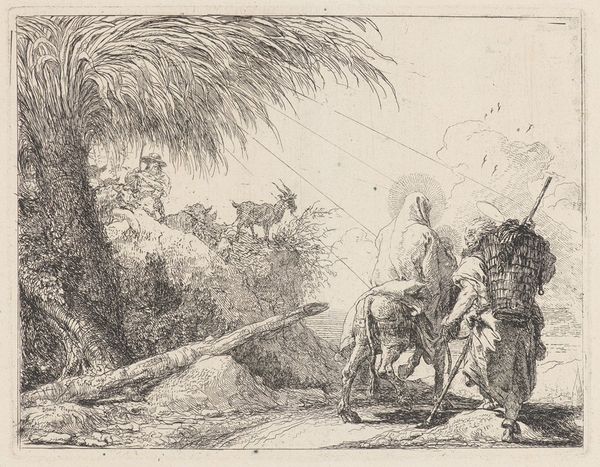Giovanni Domenico Tiepolo created this print called 'The Rest on the Flight with Joseph in Adoration' some time in the 18th century. The image depicts a familiar scene of the Holy Family during their journey to Egypt, but it also reveals much about the social and institutional context in which it was made. Consider the setting. The scene is framed by a tree, offering shade, which provides an intimate space for the family and contrasts with the landscape. This imagery resonates with the prevailing religious culture of 18th century Venice, where the Church held significant power and influence. The meticulous details and delicate lines, achieved through etching, indicate Tiepolo's mastery of printmaking, a skill honed within the artistic institutions of his time. The image subtly critiques the art institutions of its own time. By choosing printmaking, a medium more accessible than painting, Tiepolo democratizes religious art. To understand Tiepolo's work fully, we need to consider the social and institutional history of Venice, exploring the complex interplay of art, religion, and society through archival materials and critical studies.