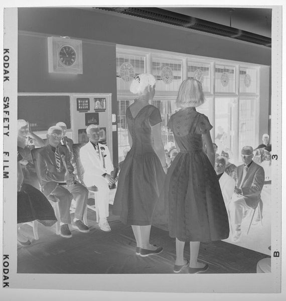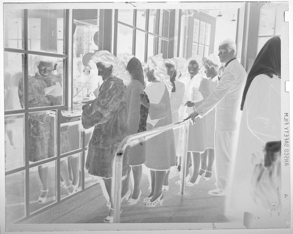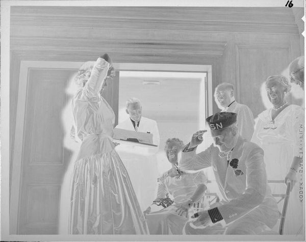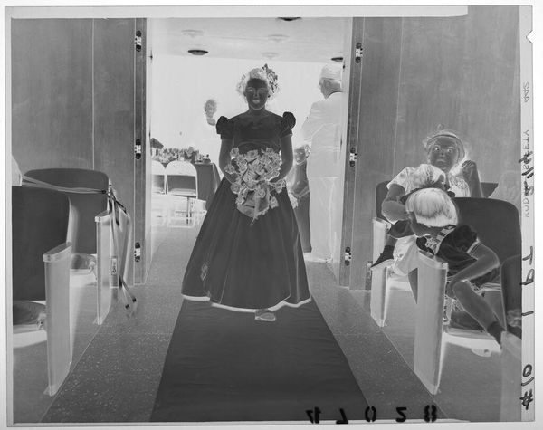 Curator: Here we have an untitled photograph by Martin Schweig, held at the Harvard Art Museums. The composition immediately strikes me as rather theatrical. Editor: Yes, it’s a departing couple framed by onlookers. Note how the figures create a visual rhythm, a dance of light and dark across the image. Curator: Precisely. The socio-economic context also plays a role; the image likely captures a moment of privilege and social ritual, departing from a wedding celebration. Editor: The contrast is stark, almost harsh. The high key flattens the subjects; it really emphasizes the costumes, the artifice of the scene. Curator: Given the lack of specific details, it invites broader reflections on marriage, performance, and the gaze of society. Editor: Agreed. The picture presents a compelling study in form and social dynamics.