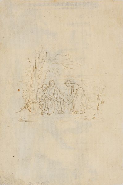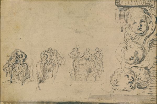 Editor: Here we have what is thought to be "Study of Neptune and Sea Creatures" by John Flaxman. It’s a very free, exploratory drawing rendered in pen and ink. It feels so spontaneous, like a glimpse into the artist's raw creative process. There's a sketch-like quality, and a sense of something grander trying to come into form. What catches your eye most in this piece? Curator: It’s precisely that sense of becoming, that potential energy held within the sketched lines that fascinates me. It's as if Flaxman is whispering possibilities to the page. I wonder, are these figures emerging from chaos, or dissolving back into it? He leaves us in that tantalizing in-between. There’s also this fascinating interplay between the monumental Neptune and these swirling, almost chaotic, sea creatures. Do you see that tension? Is it playful, or perhaps a little menacing? Editor: I do see that! I initially thought it was just loose sketching, but now I see how Neptune looms above them all, yet is part of the flurry below. It feels a little unresolved. Curator: Unresolved is a generous word. I see it more as open. Each viewing invites a new telling, a fresh perspective. It reminds me of how our own perceptions shape the world around us. Is Neptune really in command here, or just riding the wave of his own making? These studies are like fragmented reflections of an idea constantly in flux, resisting any solid meaning. Isn’t that exciting? Editor: It is, actually. I came in expecting something more straightforward, but the openness and the sheer dynamism make me appreciate the drawing more. It is like seeing the genesis of a bigger concept. Curator: And perhaps that's the greatest gift Flaxman offers here - permission to see art not as a static object, but as a dynamic process. That realization alone is worth the visit, wouldn’t you say?