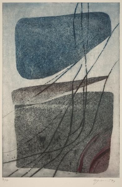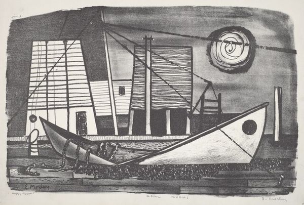 Worden Day’s undated ‘Untitled (Sailboat)’ presents us with a landscape rendered through broad areas of muted color, primarily earth tones punctuated by strokes of dark blue. Note how the composition is structured around strong horizontal lines, which demarcate the sky, cliffs, beach, and sea. This division creates a sense of layered space, yet the flatness of the color application simultaneously flattens the perspective, drawing attention to the surface of the print. The boats, rendered with bold outlines, seem almost collaged onto the scene, disrupting any illusion of depth. The structure of the cliffs appears in the background in a similar style, with the arch looming over the boats, but never creating a full illusion. This tension between flatness and depth, between representation and abstraction, embodies the artistic explorations of its time. The interplay between geometric structure and representational form invites us to consider how meaning is constructed through visual language. The work challenges our perception, reminding us that what we see is not a direct reflection of reality but a carefully constructed interpretation.