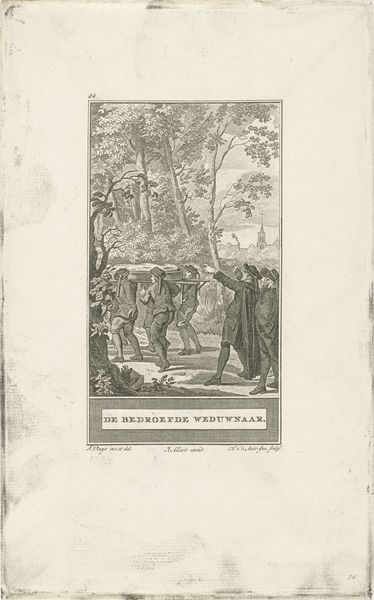 Editor: This engraving, "Rover krijgt geld aangeboden" or “Rover is offered money,” made by Noach van der (II) Meer sometime between 1778 and 1785, presents a rather stark scene. I’m curious about its purpose as it feels more like a political cartoon or societal critique than a typical artwork. What can you tell me about it? Curator: As a materialist, I see this engraving as a window into the socioeconomic landscape of its time. The work itself—the print, the paper, the ink, and the very act of engraving—speak to a growing print culture and its power in disseminating ideas. The "generous robber" is engaging in some sort of transaction: what might that signify about contemporary attitudes towards wealth and poverty, or class tensions? Editor: That's interesting. I hadn’t thought about the print as a means of distribution itself contributing to the commentary. So, beyond just the figures depicted, you're suggesting the *way* the message is delivered is crucial. But what specifically about the material components interests you? Is it the relatively accessible and mass-producible nature of engravings, perhaps suggesting that commentary of social issues could be easily distributed at the time? Curator: Precisely. Engravings, as opposed to paintings, for example, allowed for relatively inexpensive replication. How might the availability of these prints influence public discourse about morality or crime? Also, the artist's labor matters. What conditions would enable someone like Meer to create, produce and circulate such a critical piece? Does this print serve a patron, and if so how is the cultural work being supported by whom, and for what means? These are all relevant materialist questions. Editor: That does reframe my perception of the piece, and the period! So much can be said about something as seemingly straightforward as an engraving when thinking about its material and production circumstances. Curator: Exactly. Examining art through the lens of its material reality allows us to challenge notions of artistic genius. It lets us unpack art’s inherent relationship with labor and social structures and that knowledge gives you the best understanding.