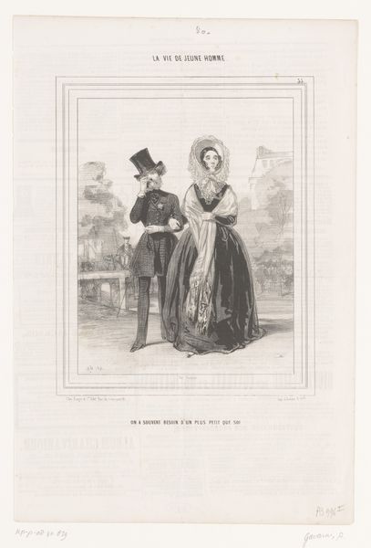 This print, by Paul Gavarni, was made using lithography, a technique that democratized image-making in the 19th century. Unlike etching or engraving, which demand highly specialized skills, lithography allowed for a more direct transfer of the artist's hand. The process begins with a smooth stone, upon which the artist draws with a greasy crayon. The stone is then treated with chemicals, so that ink adheres only to the drawn areas. When printed, the image possesses a velvety texture, a direct trace of the artist's original mark. Consider how this relative ease of production might have influenced Gavarni’s choice of subject: a fleeting, everyday street scene. Lithography facilitated the mass production of images, and the rise of mass media, mirroring the rapid social changes and the burgeoning culture of observation. The artwork invites us to consider how materials and techniques shape not only what is made, but how we perceive the world around us. It blurs the boundaries between high art and the graphic arts, reflecting a broader shift in cultural values.