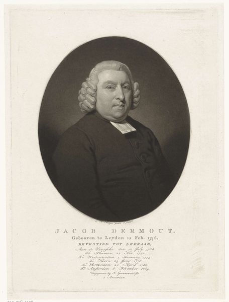 Curator: Welcome to the Rijksmuseum. We are standing before a print, "Portret van Willem Gustaaf Frederik Bentinck van Rhoon." Created between 1822 and 1826, this engraving captures the likeness of a prominent figure of the time. Editor: My immediate impression is one of controlled formality. The monochrome palette and tight framing lend it a somber yet dignified air. Curator: Indeed. The engraving, likely reproduced for wide circulation, presents Willem Gustaaf Frederik Bentinck van Rhoon within a contained oval format, typical of portraiture of the period, a strategic choice by Willem van Senus that emphasizes structure. Look at the textures created by the line work in his wig, for instance, each line placed with deliberation to give texture to the hair, and weight to the composition. Editor: I'm struck by how this image functions as a piece of political propaganda, presenting its subject, a nobleman, with unquestioned authority. It omits so much - who did this "prominent figure" serve? Who did his power marginalize or oppress? Curator: I see your point. But let's consider how the artist uses the conventions of portraiture – the subject gazing directly at the viewer, the controlled lighting, the attention to detail in the clothing – to create a carefully constructed image. Each stroke on the copperplate, each hatch and crosshatch defines form and implies light and shadow with extraordinary fidelity. Editor: It's also a visual representation of privilege and power, isn't it? I am interested in who has access to these images, then and now. How did prints like these reinforce societal hierarchies? I cannot disassociate this work from the societal framework. Curator: An interesting consideration. For me, this work of Van Senus shows a mastery of light and form; I find that its effectiveness as propaganda emerges organically from its formal success. Editor: Perhaps. Still, these details carry specific connotations of aristocratic status, and the context within which it circulates determines its meaning. Curator: Perhaps an understanding of both these dimensions--the structural and the contextual--will reveal more about both art, and ourselves.