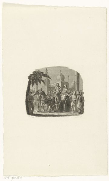 Curator: This engraving, “Man with a Child and a Second Man in a Landscape,” comes to us from Reinier Vinkeles, likely sometime between 1751 and 1816. What do you make of it? Editor: I'm immediately struck by the tension here—something about the gaze of the man on the left feels accusatory, despite the pastoral setting. And it's hard to ignore the power dynamics at play with the man, the child, and what I perceive to be some form of subjugation, if not outright slavery. The very inclusion of this idyllic European estate as background adds another layer of meaning about wealth. Curator: Well, let’s first consider the composition itself. Notice the stark linearity achieved through the engraving technique. The foreground figures are carefully positioned, creating a sense of balance that contrasts with the lushness of the implied background. Note the delicate etching and hatching: it is interesting how Vinkeles evokes spatial depth with this technique, too. Editor: That balance feels disrupted to me. The weight given to the two men is so distinct—one seems to occupy a different visual plane from the others—which highlights that imbalance of power I noticed at first glance. Also, while the fine lines are indeed skillfully executed, they arguably create a certain emotional detachment for the viewer, reinforcing the scene’s status as a captured moment of someone else’s narrative. Curator: But it is precisely this detachment that invites a deeper analysis of the artist’s intention. The controlled execution, devoid of sentimentality, presents the figures as types, allegorical representations of broader societal structures perhaps, not as personalized portraits imbued with subjective emotion. The light emphasizes their forms in such a stark way. Editor: Perhaps. However, as modern viewers, it is impossible to divorce ourselves from the historical context of the period. What narratives are silenced in favour of European male dominance in these historical depictions, I wonder? Even seemingly innocuous genre scenes were, consciously or unconsciously, perpetuating particular ideologies. Curator: A perspective worth remembering as we depart; consider this carefully crafted landscape in which the human figures become elements within a formal arrangement. Editor: An arrangement that prompts difficult questions of the past and its implications in the present.