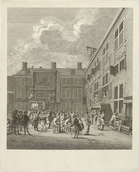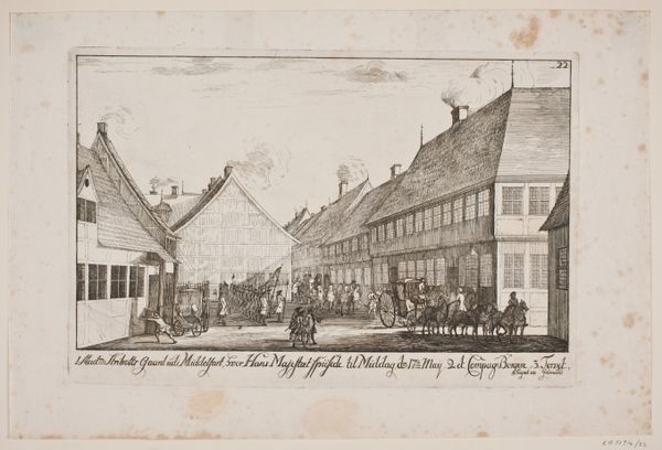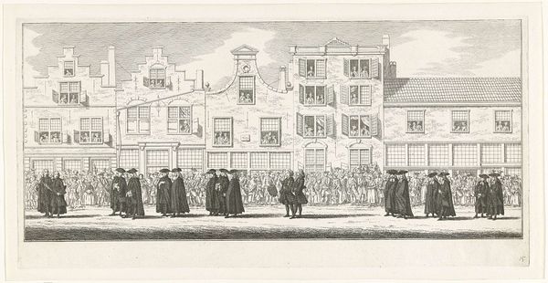 Simon Fokke made this etching in 1759, depicting the funeral procession of Anna of Hanover in Delft. It's a scene brimming with social and political significance. Delft was, at the time, part of the Dutch Republic, a society deeply shaped by its mercantile power and complex political structures. Anna, as the wife of the Dutch stadtholder, represented a crucial link to European aristocracy. Her funeral wasn’t just a private affair; it was a public spectacle, reinforcing the existing social hierarchy. The procession itself, with soldiers on horseback and crowds of onlookers, demonstrates the power and reach of the ruling class. The architecture in the background - the grand houses and formal archways - further emphasizes the wealth and status associated with Anna. We might consider how Fokke's work reflects, or perhaps subtly critiques, the opulence and formality of this event. To truly understand this piece, we must consider the social conditions that shaped its creation. Contemporary newspapers, pamphlets, and archival records can reveal the broader context of Anna’s role and the political climate of the time. Art history reminds us that meaning is always contingent on context.