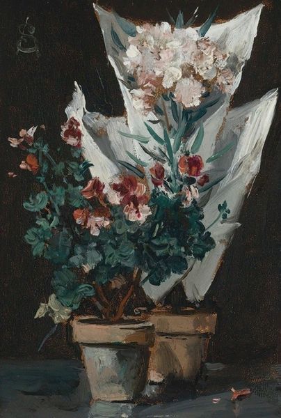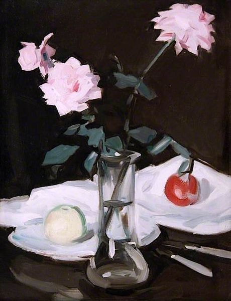 Editor: Here we have "Roses," an oil painting by Samuel Peploe. The deep black background makes the delicate pink roses really stand out. The brushstrokes seem so deliberate and highlight the physicality of the paint itself. What captures your attention most about this work? Curator: What interests me is considering Peploe’s labor and the broader material conditions of artistic production at the time. Oil paint, of course, isn't simply "there"— it requires a whole chain of extraction, manufacturing, distribution, and marketing. Looking at the thick, almost sculptural application of paint, I wonder about Peploe's access to these materials, his consumption patterns as an artist. Did he mix his own paints? Where did he source his pigments? Editor: That’s an interesting perspective. I was more focused on the Scottish Colourist movement, and how Peploe fits within that aesthetic. But I see your point; it’s about understanding the socio-economic framework in which he was operating. The luxury of accessing quality materials definitely played a role. Curator: Exactly! Consider the vases, too. Were they mass-produced items? Heirloom pieces? The context of these everyday objects speaks to the intersection of art and consumer culture. How does this knowledge alter our perception of the roses themselves, traditionally symbols of beauty and luxury? Editor: I never thought of it that way, but viewing the materials as commodities and considering the artist’s relationship to them provides a whole new lens for understanding not only the artwork but also its connection to the world around it. Curator: Precisely. And by understanding the materiality, labor, and modes of consumption intertwined with its creation, we gain a richer appreciation for its place in history.