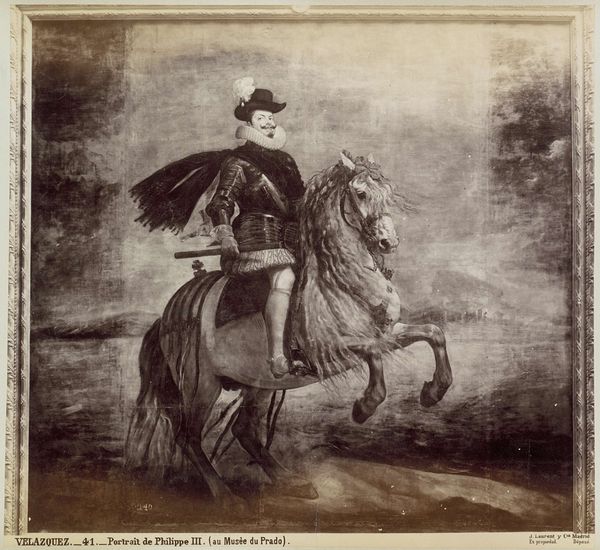 Editor: So, here we have a gelatin silver print from somewhere between 1860 and 1875. It's an anonymous fotoreproductie, capturing a painting by Velázquez of King Phillip III of Spain on horseback. It’s funny, I mostly know him from portraits looking old and tired. It gives the image a regal yet almost ghost-like quality. What strikes you about this work? Curator: You know, seeing Phillip the Third as he was *imagined* is a breath of fresh air, isn't it? Velázquez knew the King as a sort of bureaucratic leader, yes? Someone more into paperwork than gallivanting on stallions, but that doesn’t mean we can’t romanticize him! For me, that slightly faded photograph emphasizes a yearning for a grand past, a "remember when..." sort of sentimentality, even at the time! What do you suppose that says about the people commissioning *this* work, after Velazquez? Editor: I hadn't thought of it that way. I was focusing on the image itself and its historical subject matter, but thinking about its creation and re-creation later adds another dimension. It feels almost like historical fan fiction, reimagining the King. It’s kind of Baroque, kind of Realist, a bit erotic? Curator: You're spot on about those genres all swirling together, and about the slightly smoldering quality that rises from the subject and treatment! But maybe, at the same time, it's more than just that? Does that horse somehow exude a subtle kind of *resignation*, do you think? That life in the spotlight—however sumptuous—takes something *out* of all of us in the end? Editor: That’s a compelling perspective. I hadn’t considered the psychological weight on the horse—and the King! Seeing it as a reflection on the cost of power adds a whole new layer of complexity to this reproduction. I definitely feel like I’m looking at more than just a picture of a King on a horse now! Curator: Me too. Maybe this image teaches us, like all potent art, that even copies can conjure very real, lived-in sensations and feelings.
