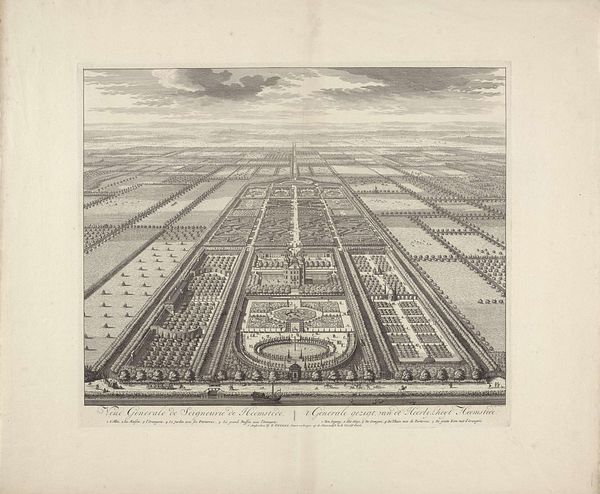 Curator: Bastiaen Stopendael created this piece, titled "View of Soestdijk Palace in Bird's-Eye Perspective," sometime between 1647 and 1693. It's an engraving, currently held in the Rijksmuseum. Editor: My initial reaction? Impeccable order! This engraving is almost obsessively symmetrical. Every tree, every bush, seems placed with geometric precision. It's impressive, sure, but also slightly... sterile, no? Curator: Well, let’s consider the period. This was the Dutch Golden Age, and Soestdijk Palace held political significance. Prints like this weren't just art; they served to broadcast power, wealth, and control. The aerial perspective emphasizes dominion over the landscape. It says, "We survey, we own." Editor: Ah, so it's less about art and more about...real estate bragging rights? Though, I admit, that bird's eye view is remarkable. It transforms the palace into this almost abstract composition of shapes. All those tiny figures walking around! Do you think they ever felt like ants under a magnifying glass? Curator: In a sense, perhaps. The Baroque style, which influences the piece, aimed to impress and inspire awe. The gardens meticulously laid out—those are intended to reflect human mastery over nature, a key philosophical theme of the era, and royal status. Editor: You know, knowing the political undertones, I see it differently. The engraving’s very tightness, the rigidity, feels almost oppressive. It's control exemplified in landscape design, almost literally mapped onto the world. The engraver gives it to us with precision, and that can feel rather potent when we consider just how ordered, how carefully staged, such views were for elites at the time. Curator: Absolutely. The very act of creating such a detailed print and disseminating it reflects the expanding print culture and its role in shaping public perception of power and space. It also contributed to ideas about the "correctness" of geometric planning in architectural theory and the importance of the aristocracy in bringing 'order' to nature. Editor: It's like looking at a carefully constructed facade, not just of a building but of an entire society. It invites you to gaze with wonder, yet simultaneously whispers about the forces holding everything so meticulously, artificially in place. What at first seems appealing for being neatly patterned comes across as tightly controlled when considering those power dynamics. Curator: It's certainly a fascinating testament to the socio-political currents of the Dutch Golden Age, revealing as much about the exercise of authority as it does about aesthetic preferences. Editor: Yes, seeing that rigid control translated through a landscape brings a whole other dimension to its apparent simplicity. Makes you consider whose perspectives are actually highlighted in such landscapes, huh?