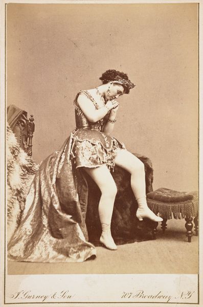 Editor: So this gelatin-silver print is titled "The White Fawn" by Jeremiah Gurney, dating to around 1868. There's an undeniably theatrical feel to the photograph, almost staged. How do you interpret this work? Curator: Well, let's consider the cultural context. This image emerged during a period of rapidly expanding commercial photography. How do you think that impacts its subject matter and its reception by the public? Editor: I imagine photography, particularly portraiture, democratized art to an extent, made it more accessible to middle-class Americans... But, wouldn't that democratization also commercialize art forms? Curator: Precisely! The subject, likely a stage actress or dancer, and the deliberate costuming speak directly to that burgeoning market. This is erotic art playing with a mythical figure, all being made accessible by the popular medium of photography. Also, the legal text at the bottom refers to a court in the Southern District of New York. How does that geographical placement change the reading of this image? Editor: I guess with New York being such a big stage for theatricals and performing art, plus copyright registration. The location gives it an indication of distribution and further cultural impact. What considerations about copyrighting an image should be made today as opposed to back in the 1860s? Curator: A lot! Today we need to be thinking about the nature of reproduction online, digital property rights, who the actress was. Were they compensated properly for image circulation? Were they being exploited by the owner and distributer of the photography at the time? Editor: I never thought I could gain new perspective from just a single piece! There really are lots of things to analyze by carefully reviewing an image's history. Curator: Indeed. Considering art as a product of its socio-political moment allows us to understand both its immediate impact and lasting relevance.