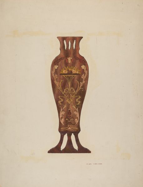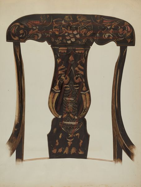 Curator: Here we have "Mantel Detail," created around 1936, likely using colored pencil on paper to represent woodwork. Editor: My first thought is weight—it appears dense, almost aggressively substantial. The artist really emphasized its physicality through meticulous detail. Curator: Indeed. Notice how the artist meticulously renders the varying textures. The polished smoothness of the column contrasts sharply with the intricate carvings surrounding it. The use of color enhances these qualities, creating depth and shadow to underscore each individual element. Editor: That lion, though—it isn’t just decorative, is it? Throughout history, lions have stood for strength, nobility, and often royal authority. It suggests the homeowner was trying to project power and grandeur. Curator: Exactly. And consider the scrollwork and acanthus leaves—hallmarks of classical design—reflecting aspirations toward order and refinement, a connection with a noble past. The upward motion of the acanthus may represent triumph. Editor: The combination is powerful. It’s not merely decoration, but a symbolic representation of wealth, power, and culture, distilled into a single architectural component. It presents how important even interior aspects were, a desire to embody and convey success to all who entered the space. Curator: Precisely. The artist captures that ambition, giving us an object lesson in status and style through formal design. It exemplifies material expression within architecture. Editor: Seeing the power dynamic so nakedly laid bare, in this level of detail, does make me pause and consider what we choose to surround ourselves with and why. Curator: A potent consideration—brought to the fore through careful contemplation of its structural form and rich symbolism.