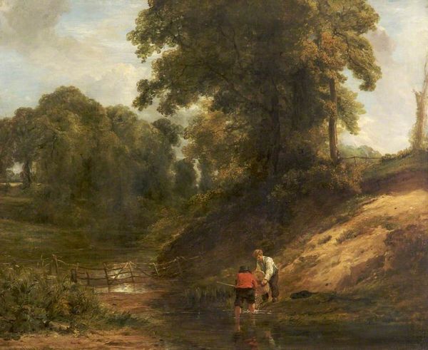 William Collins created this painting of The West Front of Clumber House using oil on canvas. The strokes are visible in the sky and landscape; he blended these together, building up the image gradually. Collins's artistic approach emphasizes the material and process of painting itself, using techniques that were considered 'high art' at the time. Oil paints were manufactured and sold commercially, but artists mixed and applied them individually, making their own decisions. Here, he captures a scene of aristocratic life – the impressive Clumber House – set against the natural world. Look closely, and you can see a figure sitting on a felled tree in the foreground. The figure appears to be a worker; note the contrast between the person’s labor, and the leisurely estate in the background. The amount of work involved in the production process for Collins’s painting, the manufacture of the pigments, the grinding, mixing, and application of the paint, stand in sharp contrast to the lifestyle afforded by the estate.