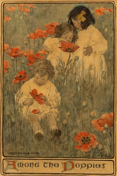 Curator: This lithograph, "Palais de la Femme. Exposition de 1900" by Henri Privat-Livemont, embodies the aesthetics of Art Nouveau. It's a poster, after all, designed to entice visitors. What springs to mind for you? Editor: Gosh, there's a kind of tender protectiveness radiating from the piece, despite that almost lurid red background! Like, these figures—mother and daughter, maybe—are in a bubble of calm amidst...well, impending doom if you consider that intense shade of red. Curator: That red is indeed striking, and the contrast enhances the foreground figures, the woman and the girl, wreathed in blossoms. Livemont uses the symbolism of flowers intentionally; the roses, particularly, evoke themes of love, beauty, and perhaps a fragile sense of renewal. Editor: Fragile indeed! The young girl, holding what looks like a length of shroud-like fabric—or is it simply fabric—injects an unexpected hint of melancholy into an otherwise lush and idyllic image. The colour palette almost verges into the morbid too, those muddy yellows...it unsettles me slightly, I can’t quite place it. Curator: Yet there is that beauty. The sinuous lines of the decorative elements—the tendrils of the flowers, the flowing gowns—all are representative of the era. It attempts to bring together images of feminine grace with commercial art for that era’s exhibition-going audiences. There is some definite symbolic tension though between themes of childhood, nature, death and overt display! Editor: Display is right—a spectacle under threat, perhaps! Still, beyond my initial slightly unnerved response, there is a compelling narrative at work here. I wonder what these figures saw. Curator: A fascinating contemplation as the twentieth century dawned, certainly. A complex work full of questions and the eternal challenge of art to blend aesthetics, deeper symbolisms and social purposes, all vying for our attention. Editor: Definitely. There is a vulnerability under that showy Art Nouveau aesthetic that's easy to overlook, but once you notice it, you just can't shake it off. Makes you question everything, almost!