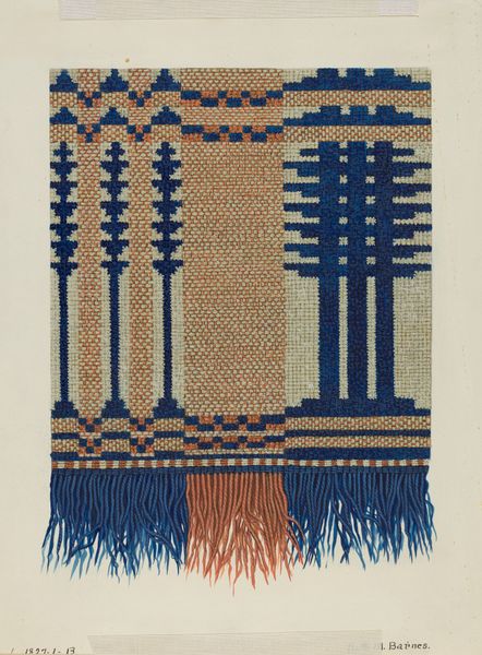 Editor: Here we have *Coverlet Detail*, created around 1936, it is a drawing showcasing a fibre-art textile design. The piece has an almost meditative quality, stemming from the geometric patterns. It feels very handmade and homey. What is your take? Curator: Oh, "homey," I like that. It's funny, I look at that tight geometry against those wild, hanging threads, and it strikes me as a conversation. I find it fascinating that this level of care was given to something as functional as a coverlet. Makes me wonder who was supposed to see it. The person wrapped in it? Or someone more discerning? Editor: Maybe both? A quiet act of artistry woven into everyday life? I hadn’t thought of it that way. What else catches your eye? Curator: Definitely the colour choices, it's restrained, but in the best way. The pops of brick-red set against the deep blue, give it such a dynamic energy. And how meticulously it's all rendered...makes you think about the patience, the quiet hours that went into creating this vision. Did the artist consider themselves an artist, or a craftsperson? Does that even matter, now, decades later? Editor: It’s beautiful! Seeing how those "crafts" can convey deep and expressive creative experiences makes me appreciate this textile piece in new ways! Curator: Absolutely! The dialogue between control and abandon...makes this more than just a drawing of a coverlet. It is, perhaps, an invitation to wrap ourselves in the unexpected beauty of the mundane. Editor: That is an elegant way to summarize the dialogue between beauty and simplicity. Thanks!