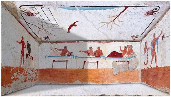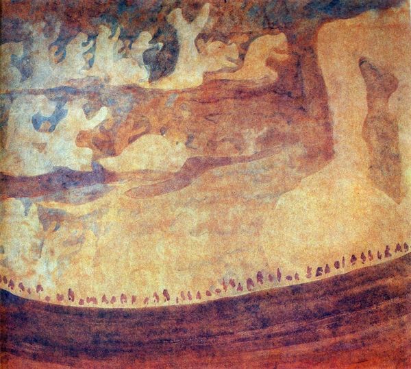 This fresco, depicting Hades abducting Persephone, was painted in ancient Greece, likely during the Hellenistic period, within a Macedonian royal tomb. The scene captures a pivotal moment from Greek mythology. Hades, god of the underworld, forcefully carries Persephone away in his chariot, an act that would bind her to the underworld and explain the cycle of the seasons. The artist uses vivid colors and dynamic composition to convey the drama and violence of the abduction, reflecting societal views on power, fate, and the roles of gods and mortals. Found in a royal tomb, this fresco suggests the elite's engagement with mythological narratives and their desire to connect with divine stories. The choice of this particular myth, with its themes of abduction and transition, may reflect beliefs about death and the afterlife prevalent in Macedonian culture. Further research into Macedonian funerary practices and mythological interpretations could reveal deeper insights into the fresco's meaning and significance within its historical context.