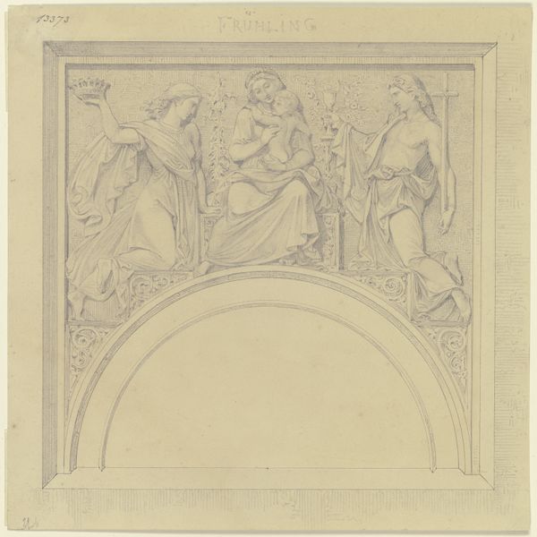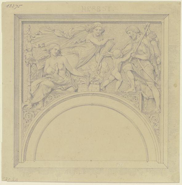Editor: Here we have Johann Baptist Scholl the Younger's pencil drawing, "The Winter." It evokes a feeling of starkness, of hardship, but there's a strange beauty in it, a cold classicism. What do you see in this piece, looking at it with your expertise? Curator: I see the weight of inherited symbolism, the visual language through which cultures speak across time. The figure of Winter, the old man, the leafless branch - they are time-honored. But what is more profound is the emotional landscape Scholl builds using these symbols. Note the figure shrouded, face hidden. This is grief, secrets buried under ice, and cultural memory being slowly revealed as seasons pass. Editor: You mentioned grief, secrets, so the figures surrounding “Winter”, what do they mean? What do they suggest? Curator: Indeed. Observe the wingèd figure with an enigmatic expression. Winged figures often denote messengers, the passing of time, or even a certain grace. Consider too, the figure with its face buried in its hands - anguish. She’s connected physically, grasping Winter. A yearning. This drawing operates on a deeper level, reaching our primal understanding of loss and our wish to be free from sadness, even while the wingèd messenger can signal time or graceful passage from grief. How interesting that both grip "winter." This symbolizes that loss or hardship is always present even with freedom and passage from darkness. The piece evokes those emotional truths and that is deeply Neoclassical and human. What are your thoughts? Editor: That tension is palpable. The cold classicism is offset by a vulnerable quality. I initially focused on its visual elegance, but understanding its emotional weight shifts my perspective. I am now viewing and reflecting more on the cultural symbols of grief and sorrow, which were buried. Thanks. Curator: Precisely. And that recognition, that cultural echo, makes the artwork live on and that's how our humanity perseveres.