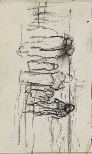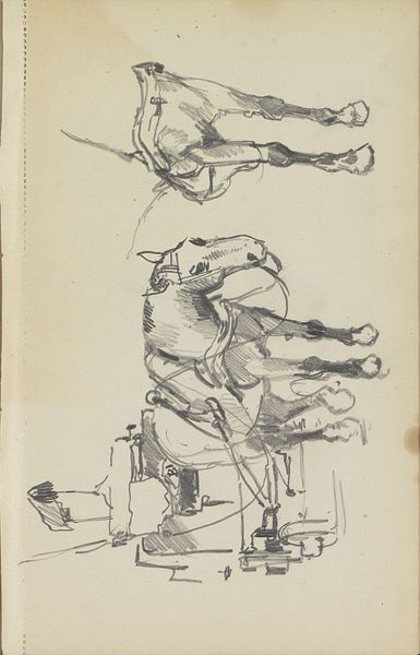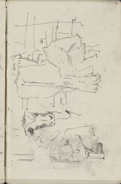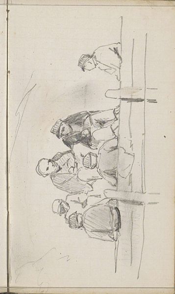 Curator: This is "Paard en figuren op een kade," or "Horse and Figures on a Quay," a pencil drawing on paper created by Jan Willem van Borselen around 1868 to 1878. Editor: It feels like a fleeting moment, doesn’t it? A captured glimpse, almost a secret stolen from a busy harbor scene. The sketchiness adds to that sense of immediacy. Curator: Absolutely. It’s fascinating how Borselen used such simple materials, just pencil and paper, to convey a sense of a bustling working environment. I’m thinking of the dockworkers and stevedores who populated quaysides like this at the time. Editor: The choice of pencil as a medium is interesting, it suggests an everydayness and a disposability to the artwork. As if drawing was simply the handmaiden of labor... or perhaps an aristocratic escape from such things. The rapid, almost frantic strokes, give a sense of urgency too. I’m curious about the paper itself, was it fine quality, or something more readily available? Curator: The Rijksmuseum catalogue doesn't specify the exact paper, but you're right, it would speak volumes. Think about what we often overlook – the mills that produced the paper, the forests they came from, the laborers involved there. A simple drawing hints at an entire economic ecosystem. Editor: And the figures! They are so roughly drawn, but their very presence suggests a hierarchy: the horse as a beast of burden, the handlers and the unseen labor they undertake… I'm wondering about the narrative, who these people are and what's being loaded on or off of those boats. Curator: Van Borselen wasn’t trying to immortalize these workers as individuals, I feel. Rather, he sought to document the essence of dockside activity. His attention to the horse suggests the animal’s central role, as both a valuable commodity and an indispensable piece of machinery. It adds to the emotional landscape of a time before the modern machine, when working animals offered so much energy. Editor: A perfect metaphor, I suppose. It makes you ponder, doesn't it? A humble pencil drawing on paper, revealing the monumental complexities of labor, materials, and human life along the quayside. It leaves me thoughtful about how seemingly insignificant things can carry great weight. Curator: Precisely! Next time you see a simple sketch, remember the world held within its lines. The artist, the materials, the people—all interconnected in ways we might not initially imagine.