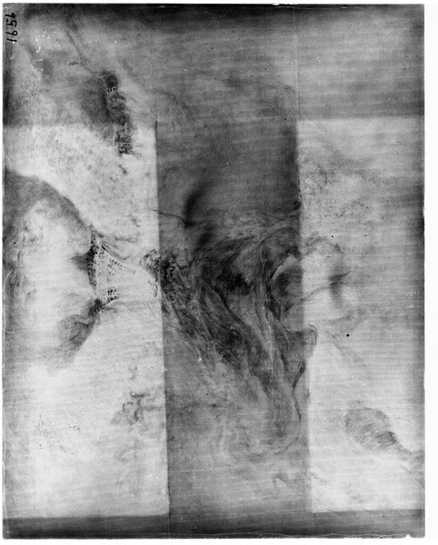 Editor: Here we have an X-radiograph of "Mrs. Fort" after Gilbert Stuart. It's like seeing a ghost of a painting! What stories do you think this reveals about the artwork's past? Curator: Well, it's like peering beneath the skin, isn't it? The cracks, the repairs... each tells a tale of time's touch, of choices made to preserve her image. What do you imagine "Mrs. Fort" herself would think of this ghostly portrait? Editor: I never thought about her reaction! It's like archaeology but for art. Thanks! Curator: Precisely! Every layer whispers secrets if we only listen closely enough.
