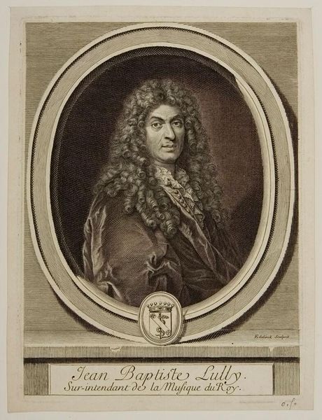 Editor: Here we see a portrait of Jean Baptiste Lully, created by Jean Louis Roullet. What strikes me is how the image is framed by text and symbolic objects. How do you interpret this work? Curator: The framing acts as a cultural memory device. Notice the lyre. It anchors Lully's identity to music and poetry, recalling the ancient Greek tradition of the Orpheus myth and courtly entertainment. What emotions does the lyre evoke for you? Editor: It makes me think of harmony and artistic skill, but also perhaps a lost, idealized past. Curator: Precisely. The portrait doesn't just present Lully as an individual; it connects him to a broader historical and cultural narrative, almost elevating him to a modern-day Orpheus figure. Editor: That's fascinating; I hadn't considered the Orpheus connection. It makes the portrait feel less like a simple depiction and more like a cultural statement.