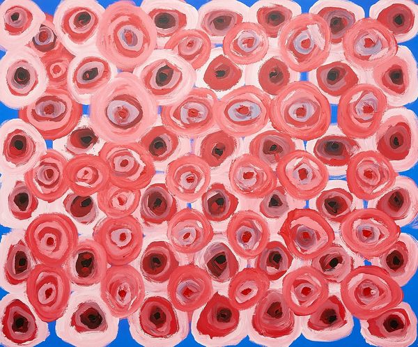 Sally Gabori’s "Plenty Fish 3" presents a vibrant field of organic forms painted with loose, gestural brushstrokes against a bright blue ground. The composition teems with life through a repetition of colourful, rounded shapes, evoking an aquatic ecosystem teeming with fish. The painting’s structure—or lack thereof—invites us to consider its significance as a system of signs and codes. The absence of traditional perspective flattens the picture plane, pushing the visual elements into a non-hierarchical arrangement. In doing so, the painting destabilizes conventional modes of representation, challenging our perception of space and form. The semiotic function of the ‘fish’ motif is diffused, suggesting a move away from fixed meanings towards a more fluid understanding of the natural world. The painting’s open-endedness allows for ongoing interpretation. The vibrant colouration and rhythmic composition invite us to consider how abstraction functions not merely as aesthetic pleasure, but as a profound engagement with ideas about nature, representation, and the very act of seeing.