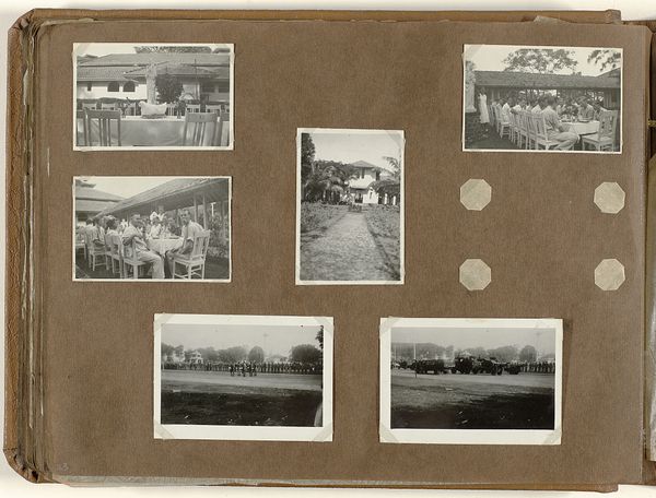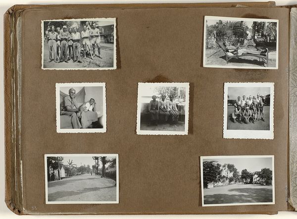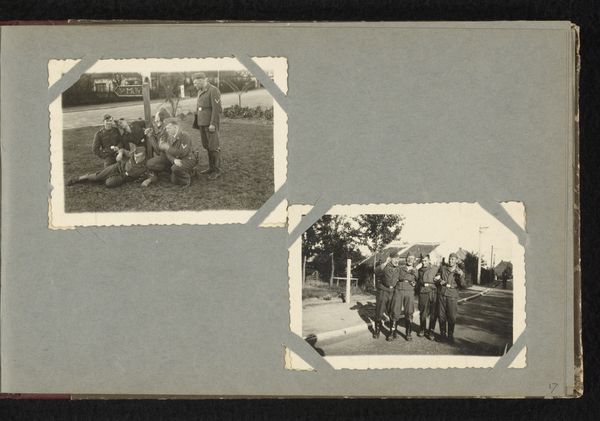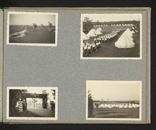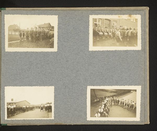 Curator: Here we have a fascinating photographic print dating from between 1935 and 1938, titled "Militaire ceremonie." It appears to be an album page with several images documenting some kind of military event. Editor: It has an interesting documentary feel. Stark and grainy, it gives off a distinctly pre-war atmosphere, full of that impending tension. The geometric framing adds to that sense of rigid structure. Curator: Indeed. These are gelatin-silver prints, so the tonal range is quite distinctive, ranging from deep blacks to bright whites. We see formations of soldiers, mounted officers, and even a marching band, suggesting a formal occasion. Notice the framing of each individual shot, how the artist positions the action within rectangular snapshots with jagged edges. Editor: It's like looking into separate boxes of contained movement. Each photo operates as a distinct scene, and the placement in a series gives rhythm to what is actually a collection of pauses. Look at the sharp contrast, the lines of men almost blend into the background. The formality becomes quite unsettling. Curator: I agree, there's a detachment at play. What interests me is the artist's seeming intention, the way in which a mundane record of daily life is transformed into an aesthetic commentary. By focusing on the composition and framing, these images transcend their immediate subject matter. I also find that these shots could almost be documentation that later becomes propagandistic due to where this album eventually resided during WW2, however that wasn’t necessarily the intention of the artist originally. Editor: Perhaps a desire to impose order, mirrored in the photograph's composition? I like the idea of accidental or retrospective messaging. Thinking about the time they were created, there is a sense of inevitable march here. They force us to confront the raw, constructed nature of authority and how these tools are used. What do you think makes this work stand out, in retrospect? Curator: The way it captures the visual language of power, the clean lines and formations create that sense, not with any judgement, simply with detached precision. As if they’re letting the images tell the story of a certain cultural momentum. It gives an unsettling clarity to history, making you stop to notice that at a given point this type of formation or the power it signified were everyday life. Editor: Yes, something is deeply unnerving and fascinating in equal measure. The way visual structures can echo underlying systems.