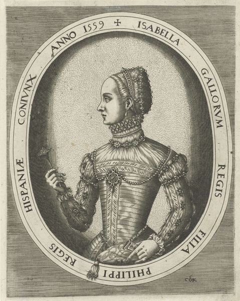 Curator: I’m completely drawn in. It’s almost dreamlike; a quiet face peering from within the armor of her intricate ruff and heavily embellished gown. Editor: Indeed, and if you could step a little closer, you’ll see we’re observing "Portrait of Queen Margaretha Leijonhufvud of Sweden." This print, etched and engraved in 1559 by Frans Huys, is currently held here at the Rijksmuseum. Curator: Armor really is the word. I'm thinking of her interiority, shielded by layers of decorum and wealth, those sumptuous fabrics… they simultaneously fascinate and feel a bit suffocating. Editor: Precisely. It is interesting to think of portraiture’s role here – not simply to reflect likeness, but to perform status. Note the text encircling her image: this reinforces her noble titles and lineage, reminding the viewer of her importance within the Swedish court. This was commissioned art for political optics as much as personal mementos. Curator: Did she choose that headdress, do you think? Was there room for her to subtly insert a part of her character in the composition? I wonder if those meticulous details gave her agency within very set parameters? Editor: That's a poignant question. The Renaissance certainly valued individual expression, yet societal expectations and patriarchal structures significantly influenced female portraiture. Queen Margaretha's identity, while individualized through her features, served to bolster her husband's legitimacy. The clothing acts as both a form of display and a cultural constraint. Curator: Even within restriction, there's beauty—a controlled grace. She’s steady. Editor: Ultimately, seeing this image asks us to consider what's communicated and what's strategically omitted when looking at these kinds of images of powerful people from the past. Curator: Beautifully said, and what lingers for me is pondering on those delicate boundaries of identity—what we willingly share, what's imposed, and what ultimately remains…private.