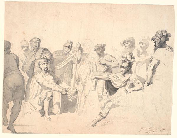 Editor: Here we have "Classical Subject (Lucretia's Dead Body is Carried by her Husband, Lead by her Mourning Father)," a drawing in ink by John Hamilton Mortimer, from the 1770s, currently at the Met. It's… well, it's certainly dramatic! The energy is almost frantic. I'm struck by the contrast between the, uh, energetic lines and the subject matter of death. What stands out to you? Curator: You know, that frantic energy, that's what grabs me too. It’s like a controlled explosion of grief and action captured with furious strokes. The ink lines, almost violently hatching the scene, really bring the high drama of Lucretia’s story alive – or rather, underscore its tragedy. What a choice to render it as an exercise in feeling rather than detail. It feels unfinished, which emphasizes her story more. The viewer fills in the blanks themselves with their own understanding of violence against women. Do you think Mortimer romanticizes the moment, or indicts it? Editor: Indicts it? That’s an interesting way to put it. I suppose the raw style stops it from feeling too idealized. It feels like he’s trying to capture the chaotic reality of the moment, but through a classical lens, right? I almost feel like a bystander at the scene myself. Curator: Exactly! Mortimer makes us witnesses to something incredibly vulnerable. Think about the figures—the rigid father, the broken husband. Are they heroes, or just… broken people in an impossible situation? I see a statement about masculinity here, maybe unintentionally. The drawing almost mocks this idea that men need to protect female purity, perhaps because he cannot see a route in society outside this model. What does being honorable even MEAN when everyone's wrecked with shame and grief? What do you take away from it? Editor: That's given me so much to think about, particularly that final question. It's such a different way of looking at this. I just thought of the drawing as just histrionic before. Thank you! Curator: Likewise! The story is in how it makes *you* feel, right? And now we’re both feeling something different. Excellent!