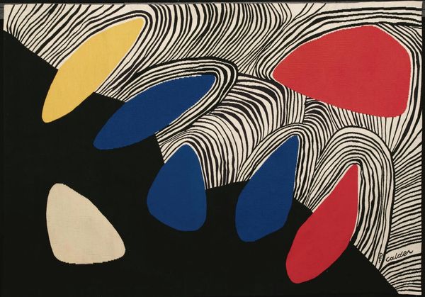 Editor: So here we have Alexander Calder’s “The Blue Leaf” from 1962, a splash of acrylic paint creating these lively, almost dancing shapes on a warm yellow background. I find it very playful. What do you see in this piece? Curator: Playful is definitely the word, isn’t it? But underneath, I think Calder is exploring something deeper, the dynamic energy of nature simplified down to these elegant forms. He's known for his mobiles, and in a way, this feels like a frozen mobile, doesn’t it? Can you almost imagine these shapes gently swaying in the breeze? Editor: I hadn't thought of it like that, but you're right. I was so focused on the colours and shapes, the flatness of it, but now I can see the potential movement. Is it the abstract nature of it that hints at movement? Curator: Precisely! And notice how the forms relate to each other – they almost seem to chase or mirror one another. It has a lyrical rhythm, like a visual poem, and in that, there’s almost a language there; it seems lighthearted on the surface but has real hidden depth if you look closer. Doesn't that resonate? Editor: Definitely! It’s like Calder’s whispering, ‘Hey, art can be fun and still have something important to say’. It makes you want to see it move, to reach out and touch it almost! Curator: It certainly does! What have you discovered by seeing this? Editor: Well, now I’m definitely going to check out some of Calder’s mobiles! This seemingly simple painting now has way more dimension for me. Thanks!