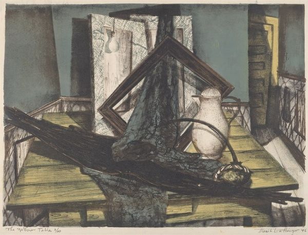 Curator: Cornelius Norbertus Gijsbrechts painted this intriguing trompe-l'oeil around 1670. It's titled "An Open Cabinet of Curiosities with a Hercules Group" and uses oil paint to create this illusion of a wooden cabinet. Editor: It's uncanny how the artist simulates depth! The colors are restrained, but it all has this unsettling effect, almost claustrophobic, as if looking into someone else's cluttered inner world. Curator: Exactly! Notice how Gijsbrechts uses the interplay of light and shadow to construct a sense of dimensionality, mimicking the texture of the wooden planks, hinges, even that small sheet of paper precariously perched on the shelf. Editor: That's one heck of a Hercules, there... all gold! This must have been for a very exclusive patron. We could interpret it, though, with reference to trade and social capital? How does Gijsbrecht speak of privilege during this moment in history? Curator: The arrangement of objects in the painting create diagonals. Note the line of the skull fragment mirroring that of Hercules in the top half, visually binding those elements. And yes, there’s a kind of dark humour to it, presenting these grand mythological figures within the modest domestic setting. Editor: Perhaps Gijsbrechts subtly comments on power structures. By including objects linked to exploration and discovery and colonial narratives, the statue transforms into more than simply decoration. Curator: These objects certainly lend to its overall aesthetic complexity. He creates these layers of perception where we are prompted to reconsider reality itself. Editor: Ultimately it is the piece's ability to make us question perception and power that ensures it resonates through generations. Curator: I couldn’t agree more. Gijsbrechts prompts contemplation through masterful simulation, inviting us to confront not just our sight but, perhaps, societal undercurrents.