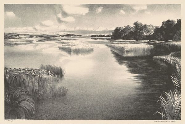 Stow Wengenroth’s "Sunlit Dunes" is a lithograph: a print made from a flat stone using greasy crayon and acid. The velvety blacks and subtle gradations of tone we see here were achieved by Wengenroth's masterful manipulation of these materials. Lithography isn't about brute force; it demands sensitivity and control. The artist coaxes the image from the stone, building up layers of tone to evoke the play of light on the rippling surface of the sand, and the coarse texture of the dune grass. Wengenroth was deeply engaged with the history of printmaking. In a sense, he took on the role of both artist and skilled artisan, continuing a tradition that predates the advent of photography, yet speaks to a modern sensibility. While we often associate printmaking with mass production, here it is a tool for capturing the quiet beauty of a unique scene. It reminds us that even within industrial processes, there's space for individual expression and craft.