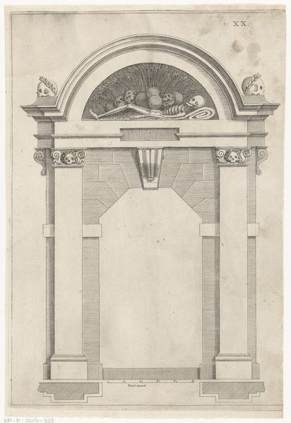 Curator: I’m really drawn in by the clean lines of this engraving, Nieuwe-Zijdts School-Poort. Dating back to 1631, it's an anonymous piece housed here at the Rijksmuseum. Something about the precision, maybe even the austerity, grabs me. Editor: It does feel almost diagrammatic. My first impression is cold calculation rather than…inspiration? What narrative might a school gate in 17th century Amsterdam offer? I am missing something…warmth, humanity, lived experience. This lacks some life in my opinion, if it makes sense? Curator: You know, it does evoke the detached perspective of an architect’s blueprint. Except then, there’s this bust perched right on top, peering out like a philosophical gargoyle. I think, in fact, it does breath life into it! Editor: Ah, but who *is* that bust? He's like a severe guardian, or maybe even a critical inspector! And does that doorway, that gate… is it truly meant to welcome or is it to serve a grand statement of educational power? Curator: Both, perhaps! It makes me think of thresholds and knowledge. Consider this gate, which has the appearance of being built out of classic elements, not as just a divide but also as a portal to possibility, even hope. In that period there was such a massive emphasis on learning! Editor: True, but learning then, wasn’t exactly equitable, was it? Architecture always implicates power, social control. Who was included within those school walls and who remained outside gazing at those who were in school? Did the “hope” extend to all? This "School-Poort" speaks of exclusion as well. The architecture reflects those societal boundaries. Curator: Food for thought, indeed. What a conversation starter – the stoic portrait gazing back, asking “Who is welcome?” Thank you for such thought provoking reflection! Editor: Thank you! It makes me consider art’s continuing ability to reveal uncomfortable truths! Even in the lines of an architectural diagram.