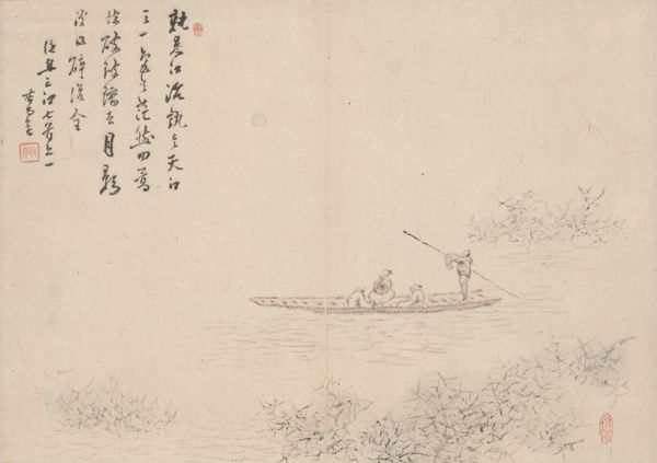 Curator: This artwork, held at the Harvard Art Museums, is titled "Old Man Fishing with Little Boy" by Qian Huian, who lived from 1833 to 1911. Editor: It’s quite serene. The muted palette and minimal composition lend a sense of quiet contemplation. Curator: Indeed. The piece speaks to a tradition of depicting idealized scenes of labor and leisure in the late Qing dynasty. Note the inscription; such elements played a crucial role in the work's overall meaning. Editor: The calligraphic marks and the strategic placement of the figures create a balanced asymmetry, reinforcing its visual harmony. I find it incredibly calming. Curator: It encourages reflection on the artist's skilled fusion of form and meaning, inviting the viewer to consider the social and artistic context of its creation. Editor: Yes, a poignant glimpse into a bygone era through delicate brushstrokes and thoughtful arrangement.